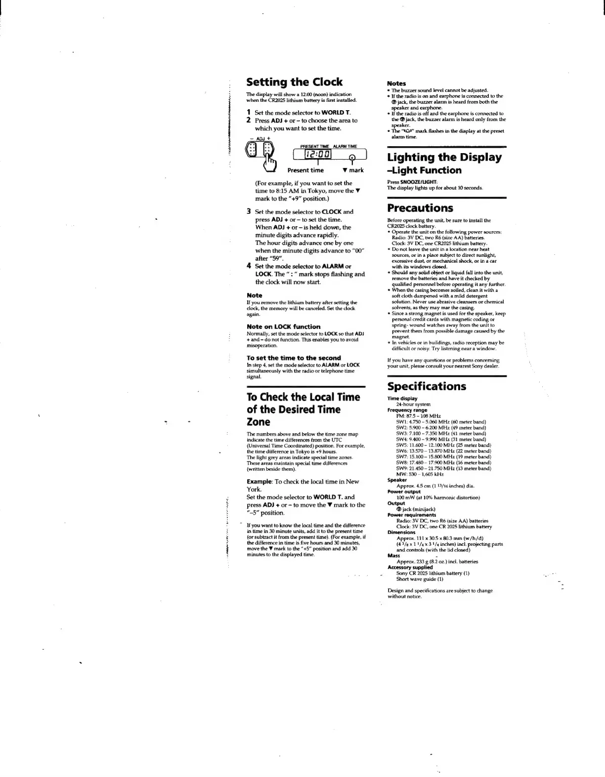 Sony ICF-SW12 - Setting the Clock; Setting the Time to the Second; Checking Local Time Zones; Lighting the Display
