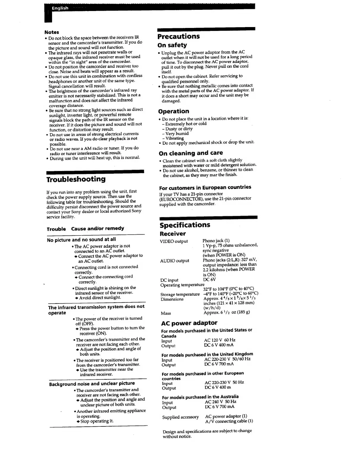 Sony IFT-R20 - Troubleshooting and Precautions; Usage Notes; Troubleshooting Common Issues; General Precautions