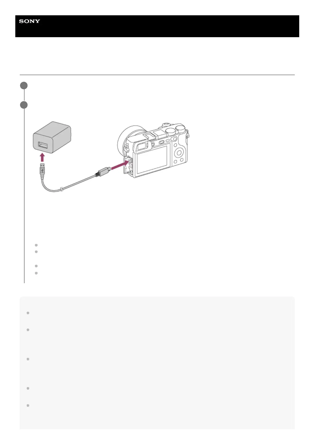 Connect the camera with the battery pack inserted to the AC Adaptor (supplied) using the micro USB cable