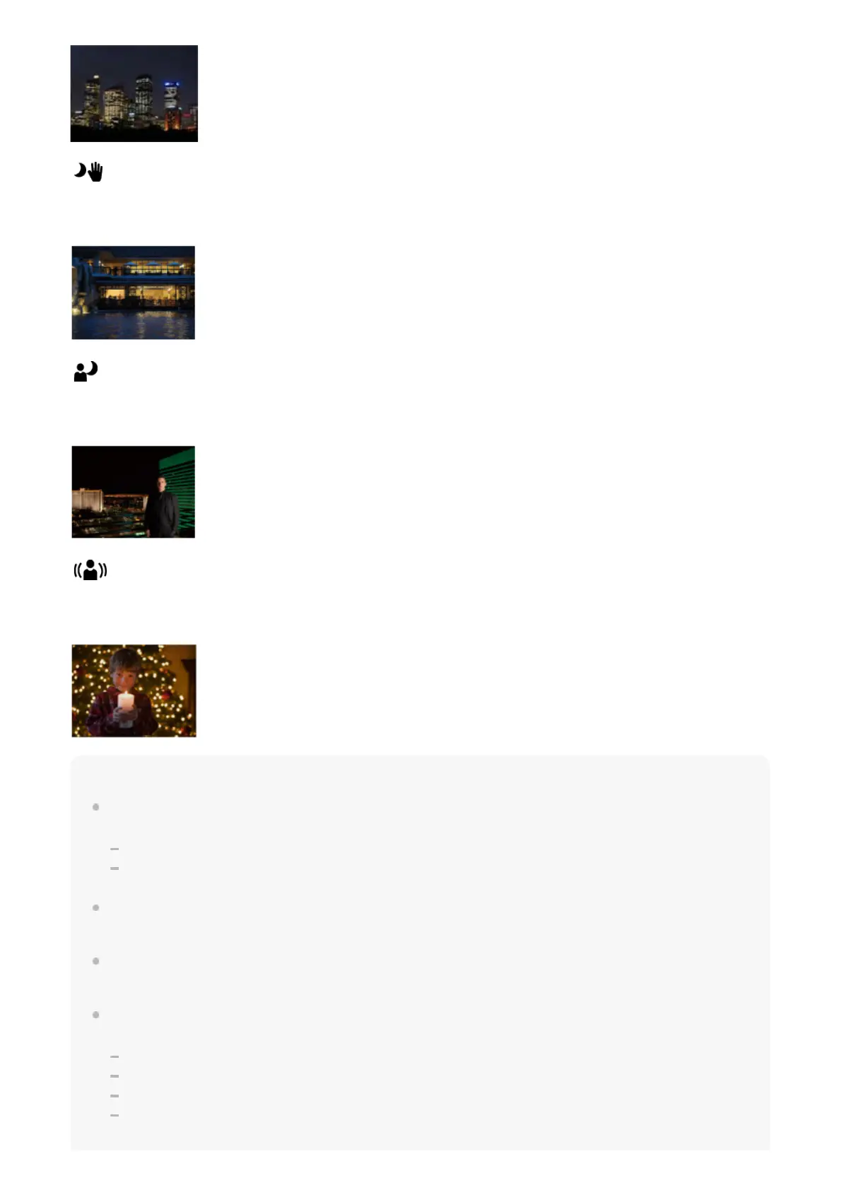 Shoots night scenes with less noise and blur without using a tripod. A burst of shots are taken,