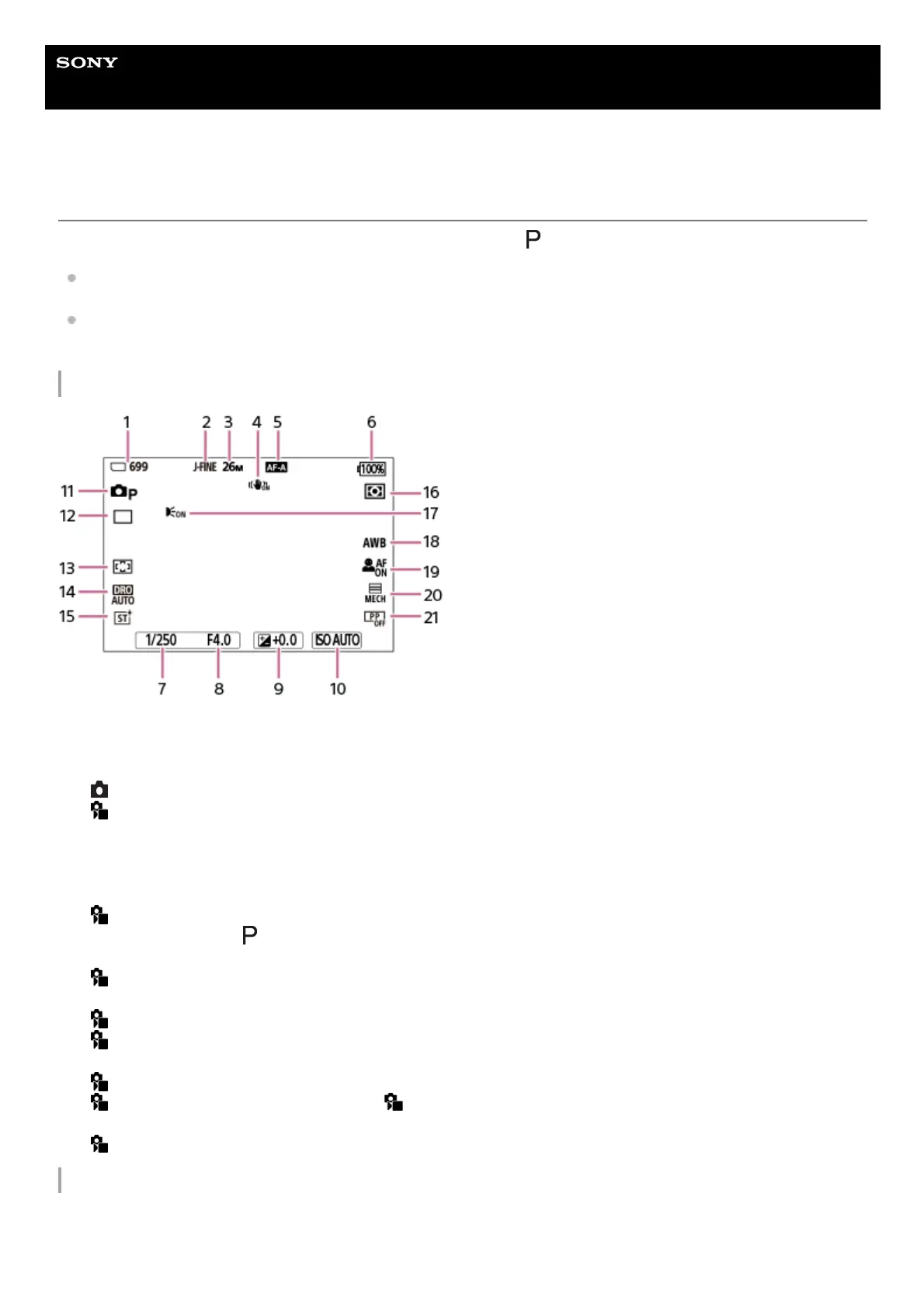 Displayed when [AF Illuminator] is set to [Auto] and the camera detects that the AF Illuminator is required.17.