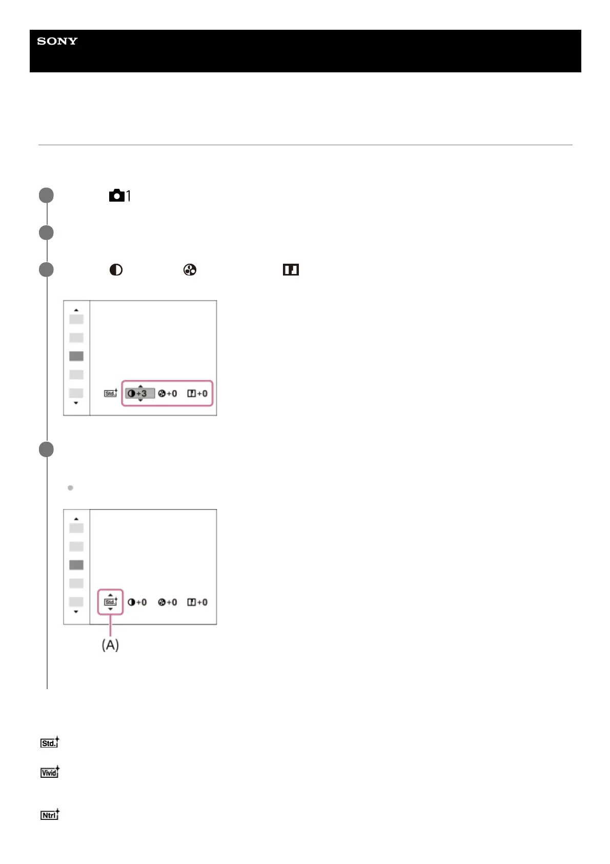 (Contrast), (Saturation) and (Sharpness), select the desired item using the right/left