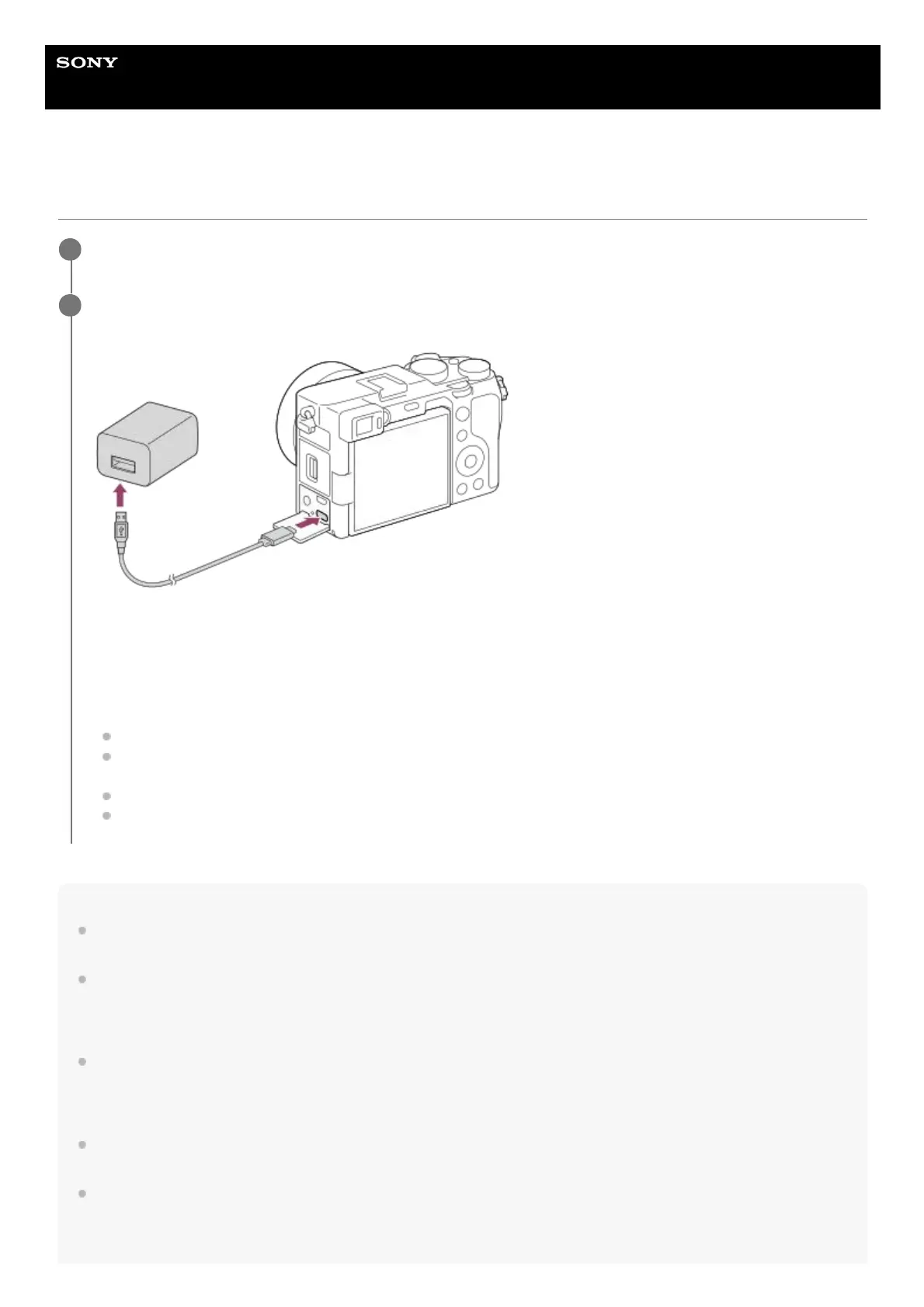 Connect the camera with the battery pack inserted to the AC Adaptor (supplied) using the USB cable, and