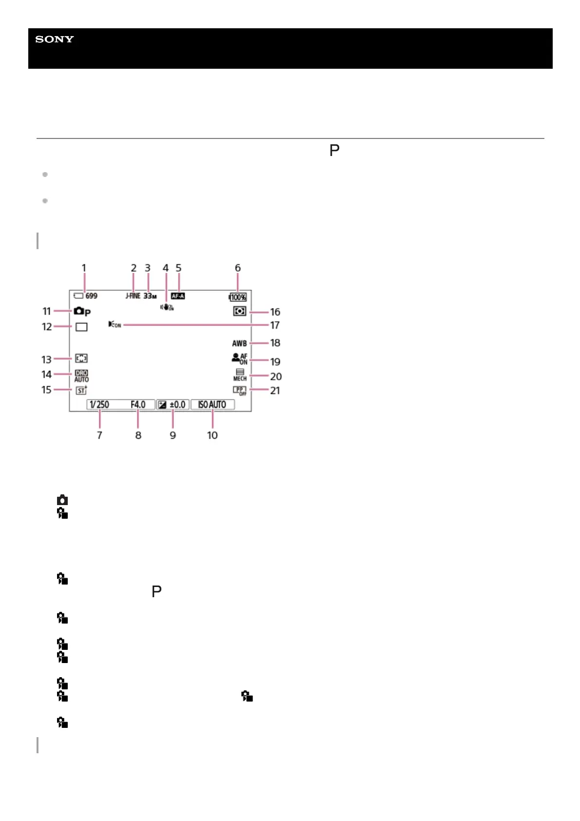 Displayed when [AF Illuminator] is set to [Auto] and the camera detects that the AF Illuminator is required.17.