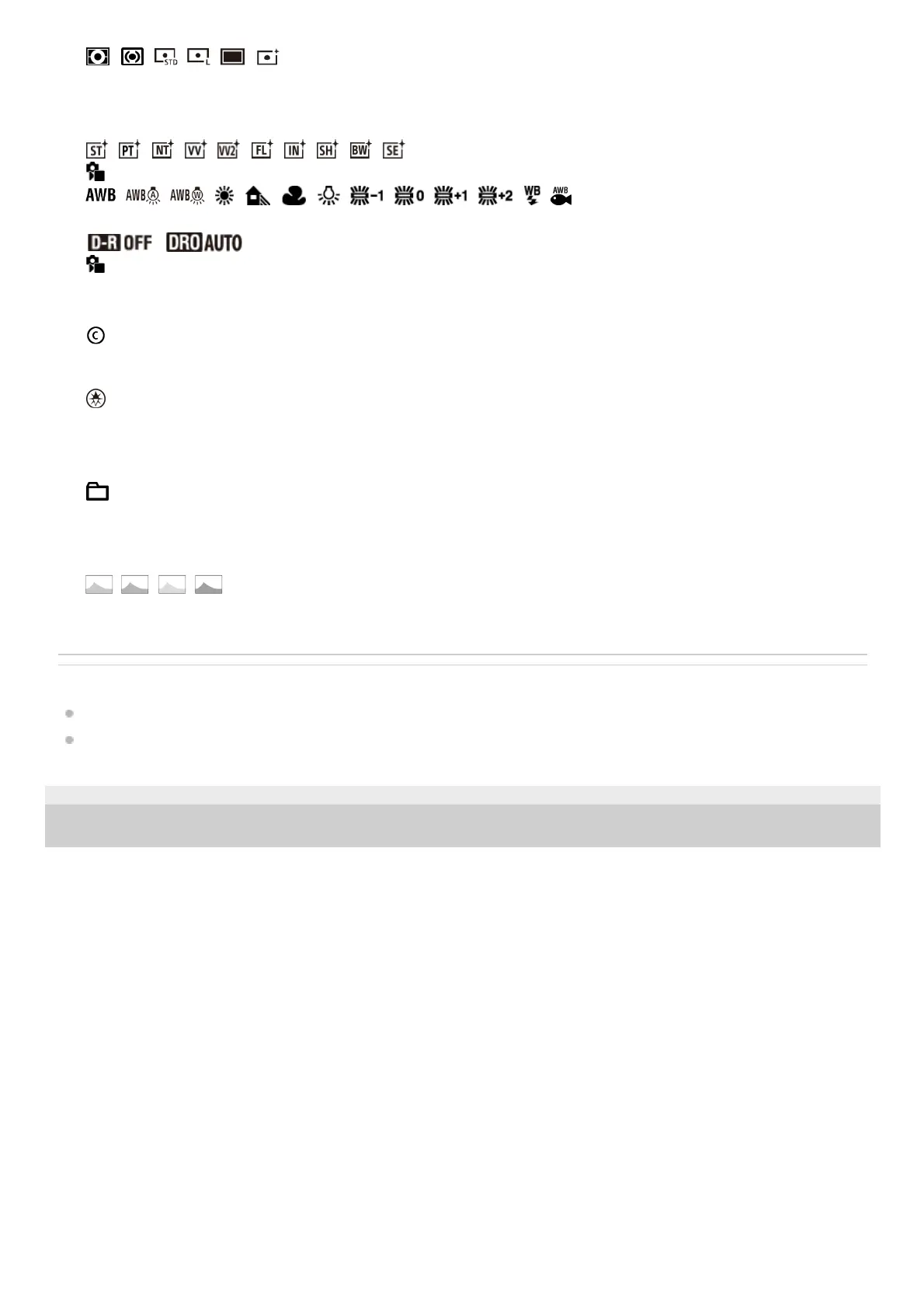 List of icons on the screen for shooting still images