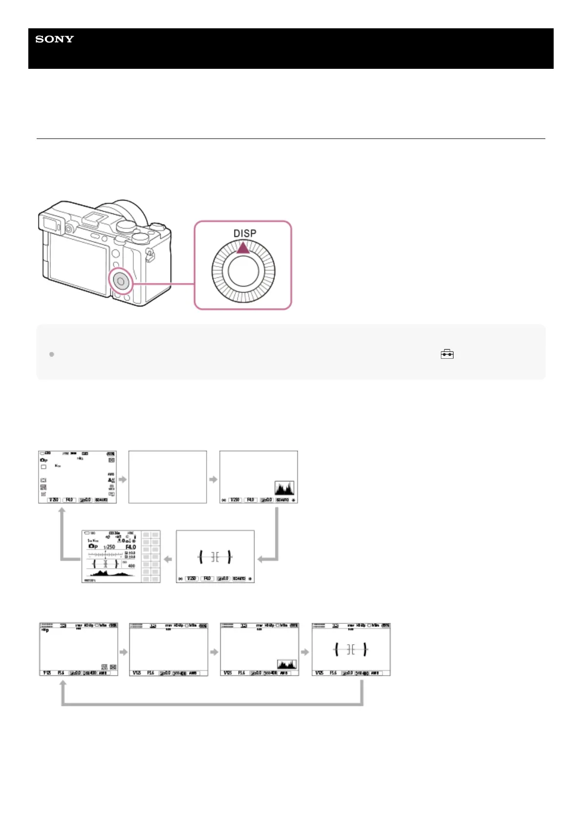 By pressing the DISP (Display Setting) button, you can change the content displayed on the screen during shooting and