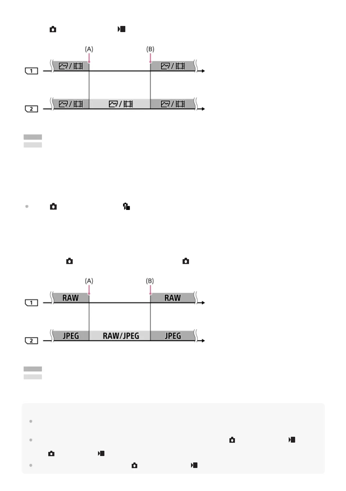 When either of the memory cards becomes full, the camera starts recording to the other memory card in both the RAW
