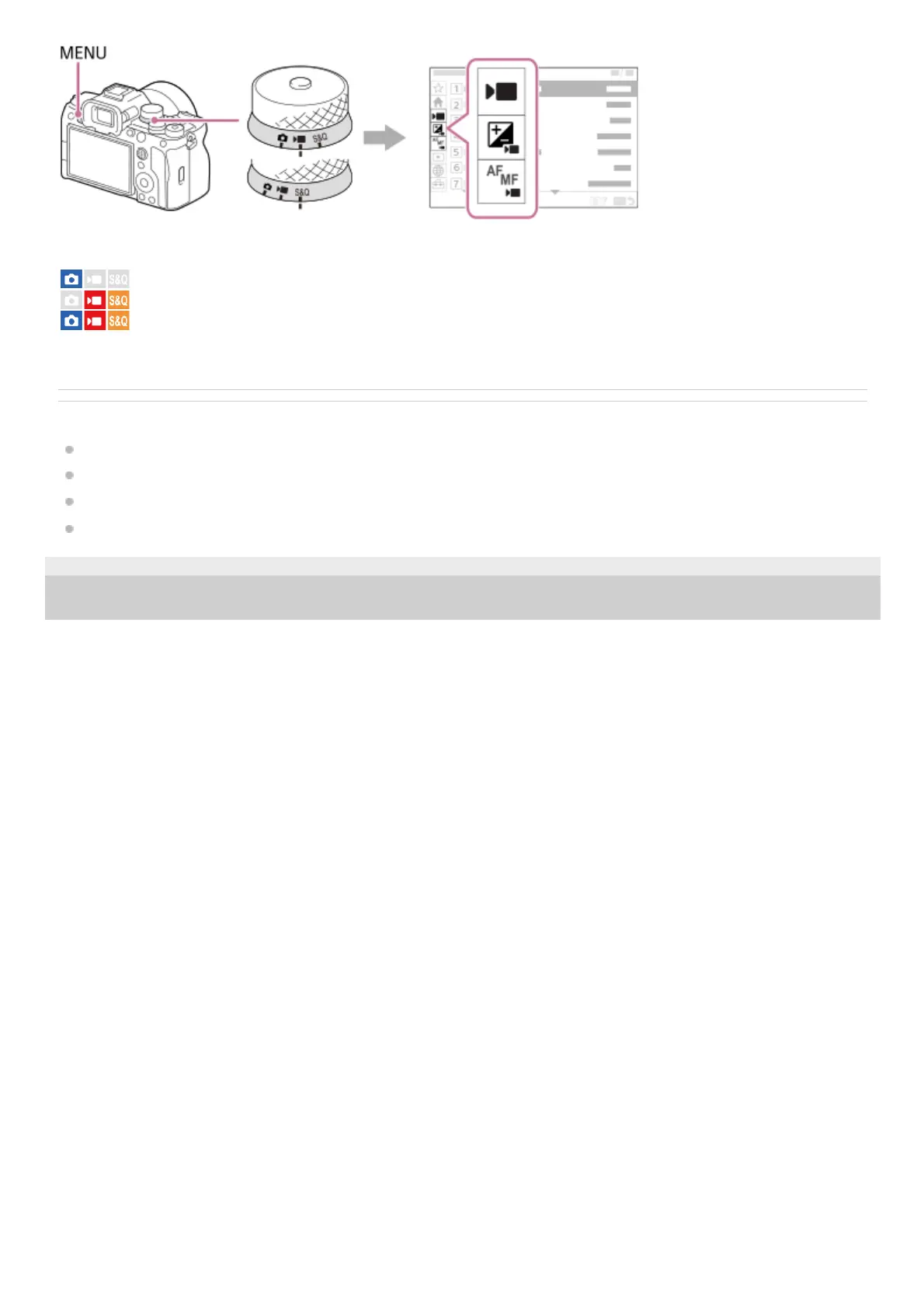 : Menu items displayed in the movie recording modes and slow-motion/quick-motion shooting modes