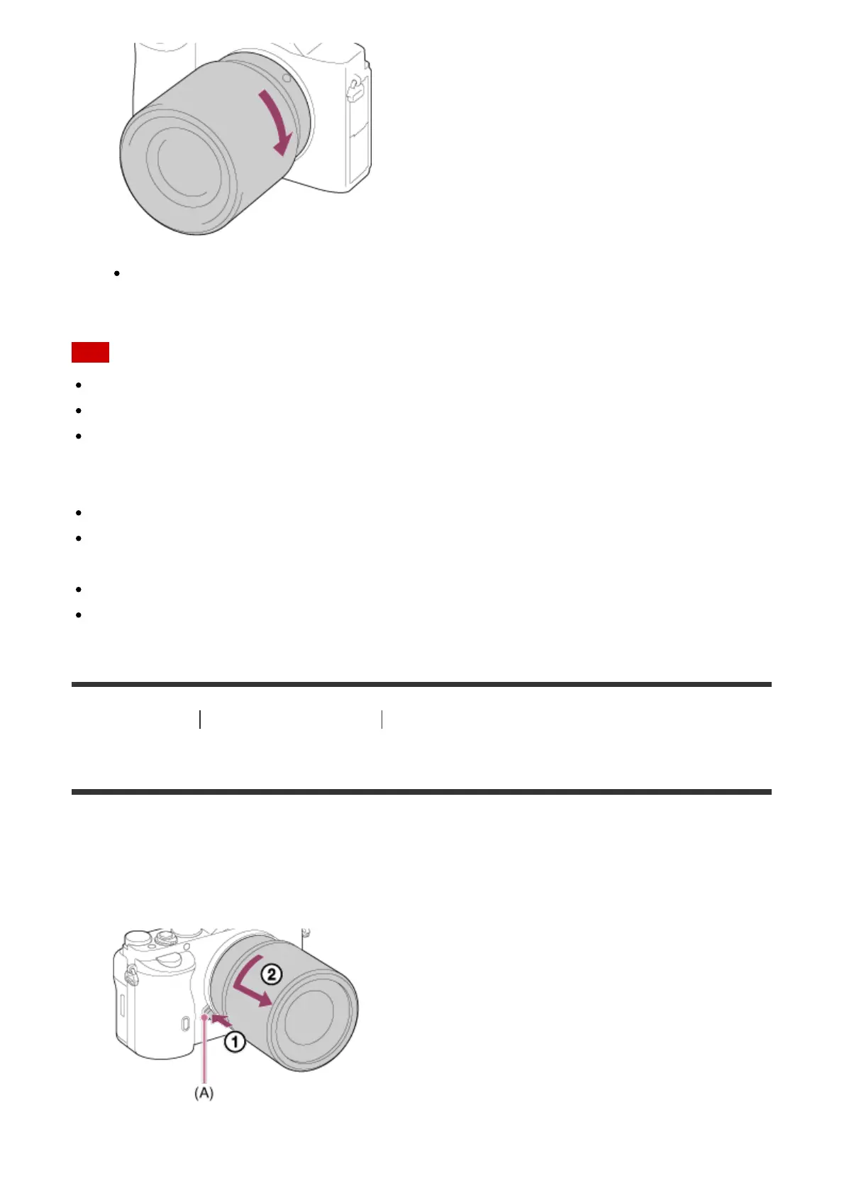 1. Keep pressing the lens release button (A) and turn the lens in the direction of the arrow