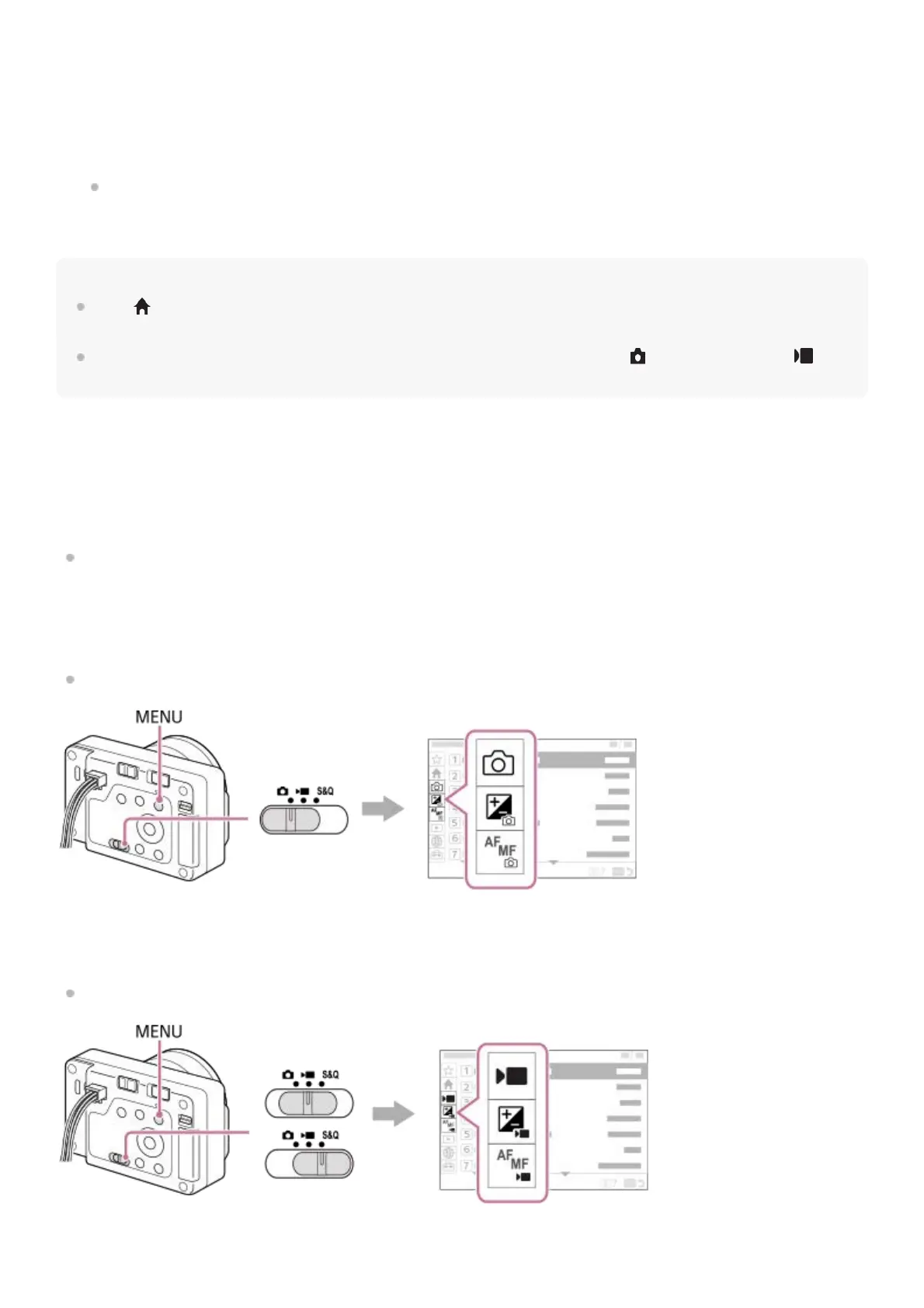 Relationship between the Still/Movie/S&Q switch and menu screen