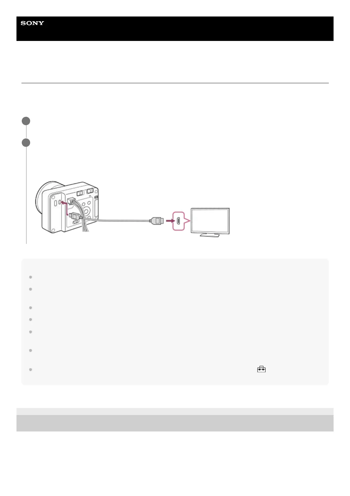 Use an HDMI cable that is compatible with the HDMI Type-D micro jack on the camera and the HDMI jack on the