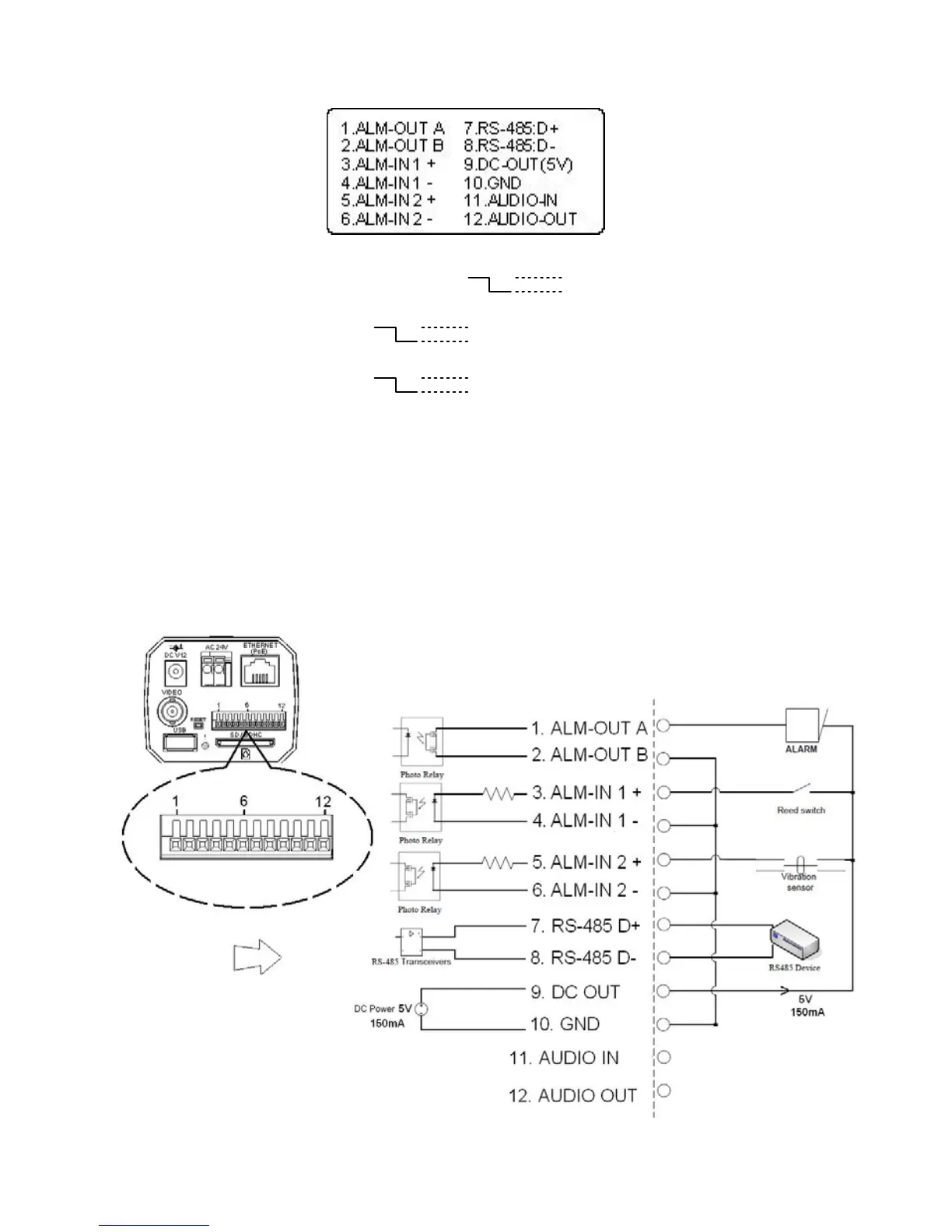 1 & 2. ALARM OUT (OUTPUT): This is an alarm output trigger. Connect this to external