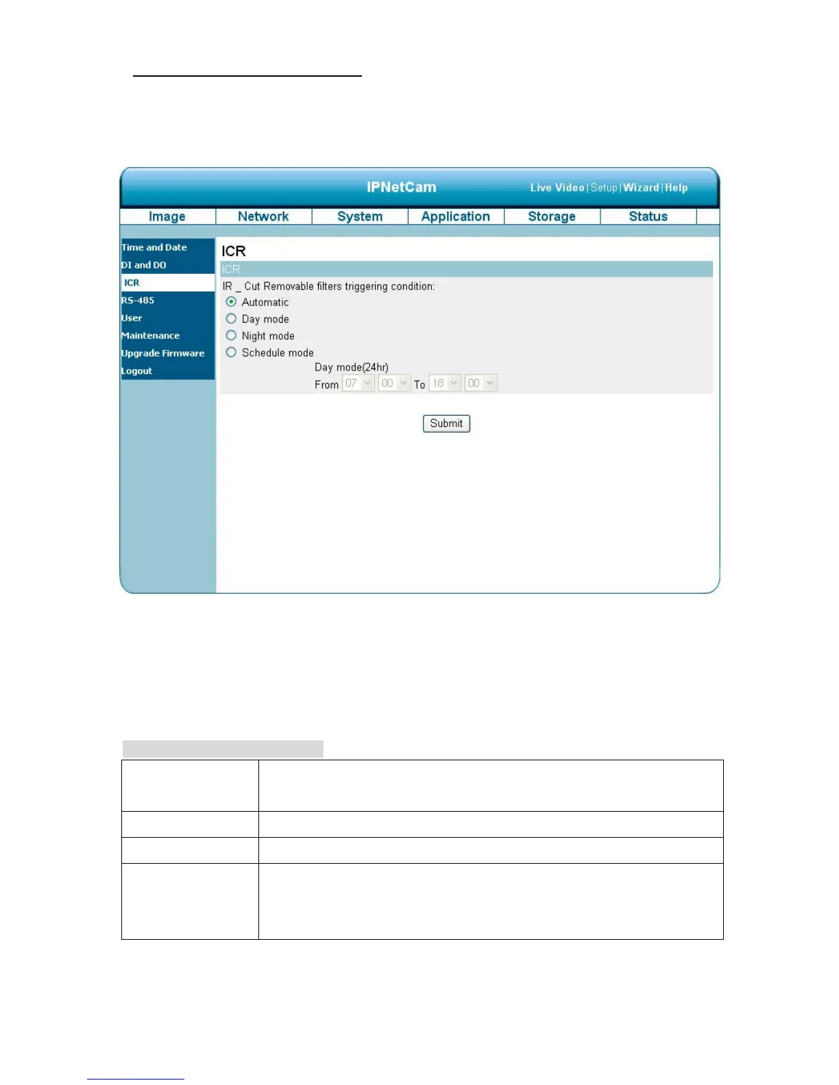 2. For the “IR-Cut Removable filter trigger condition”, mark your options from “Automatic”, “Day Mode”,