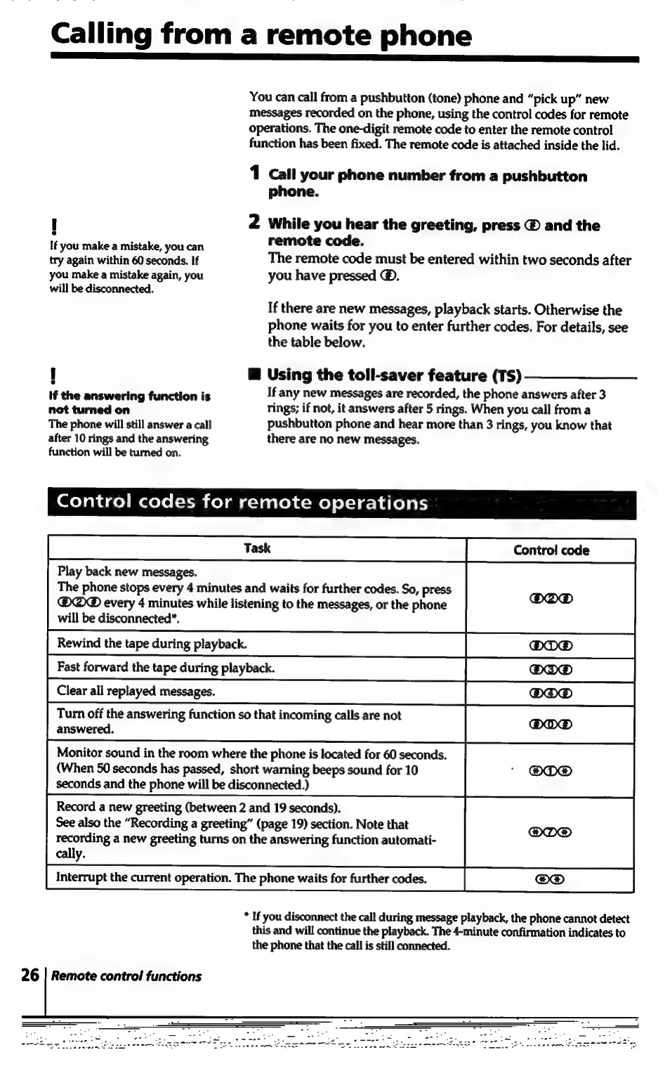 Sony IT-A100 - Calling from a Remote Phone; Control Codes for Remote Operations