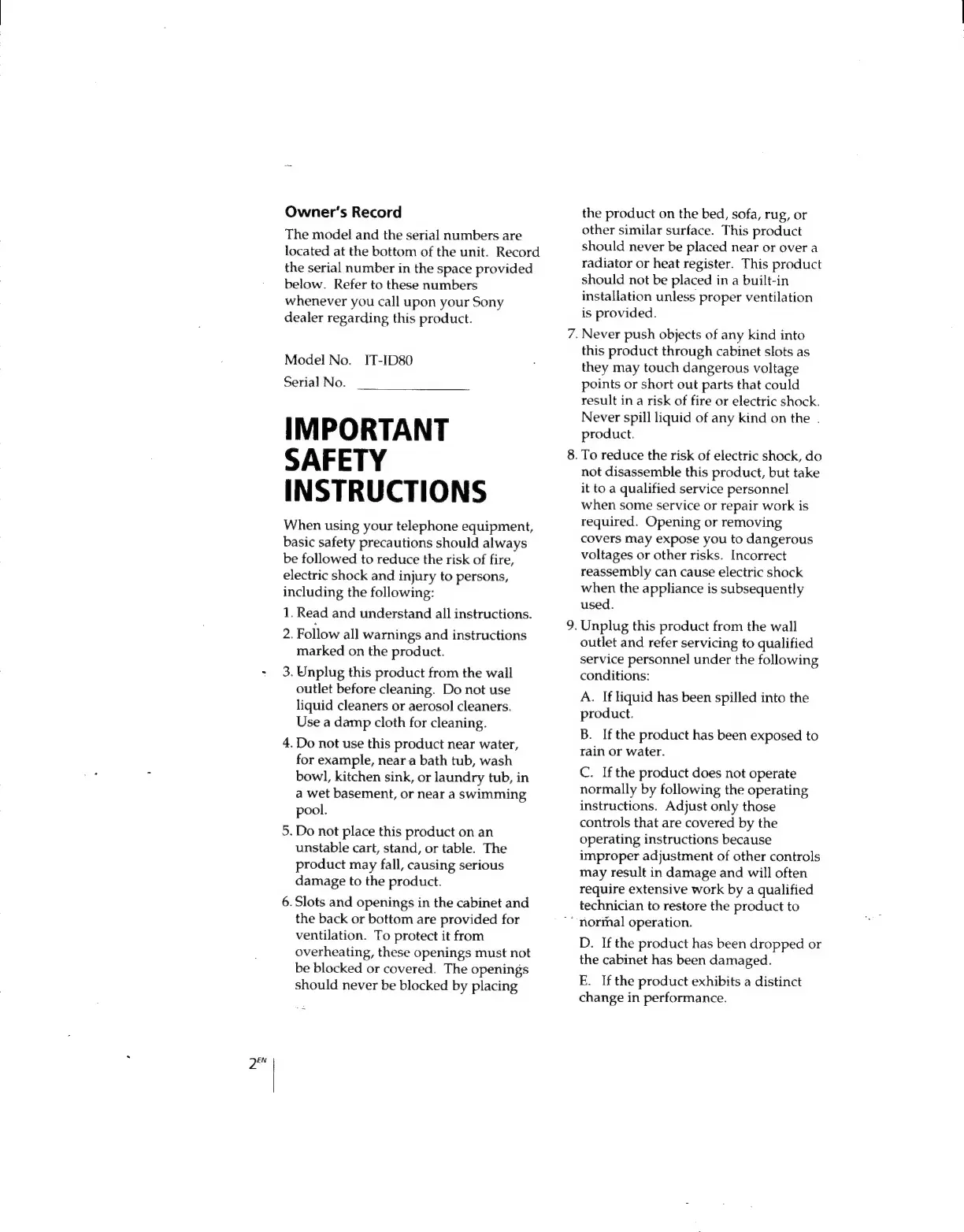 Sony IT-ID80 - IMPORTANT SAFETY INSTRUCTIONS; General Safety Precautions