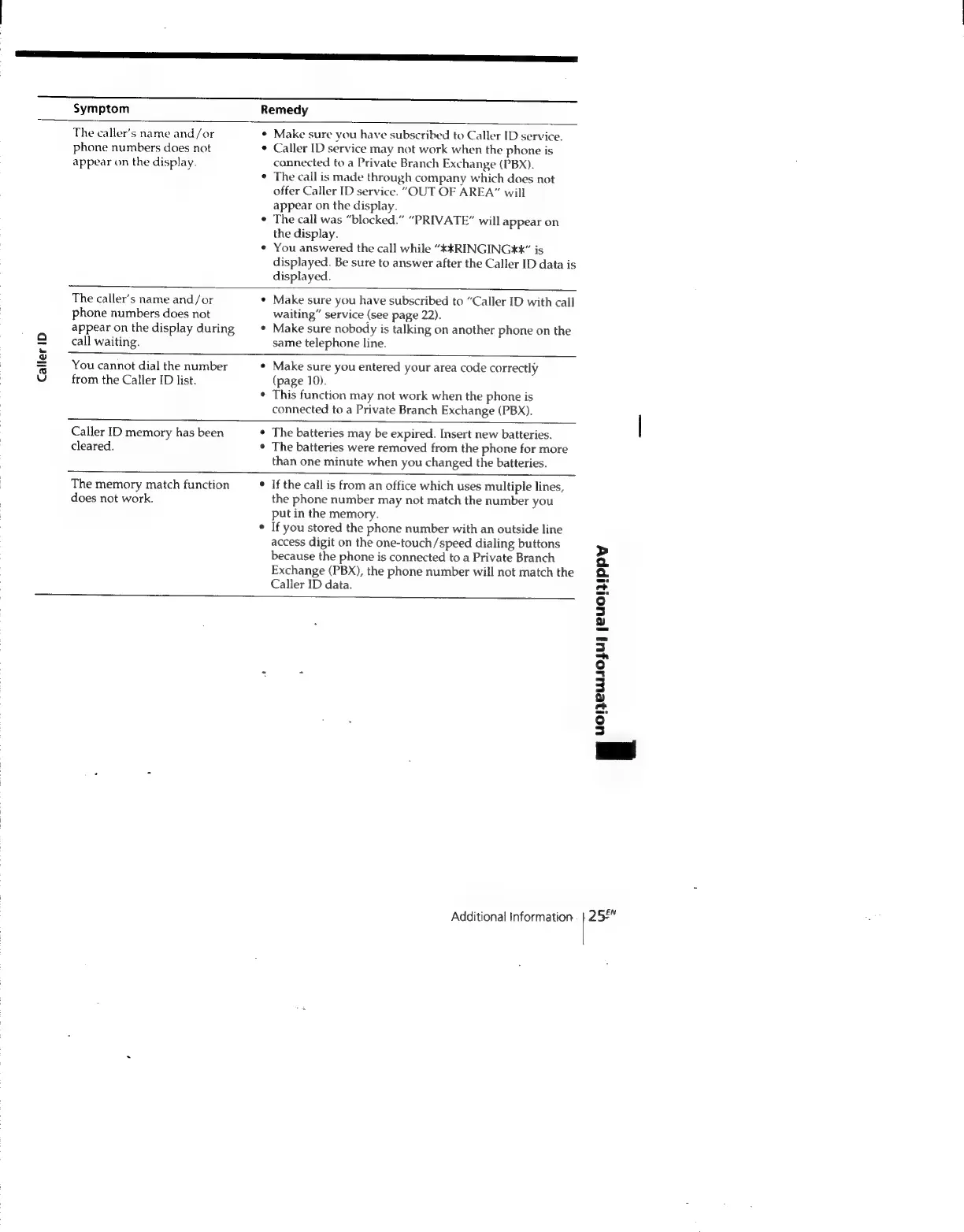 Sony IT-ID80 - Caller ID and Memory Function Troubleshooting
