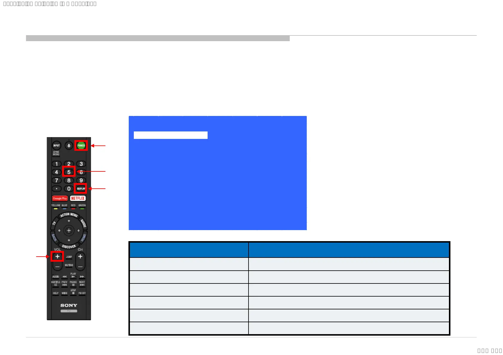 Service mode on <Display or i+(info)> <5> <Vol. Up> <Power>