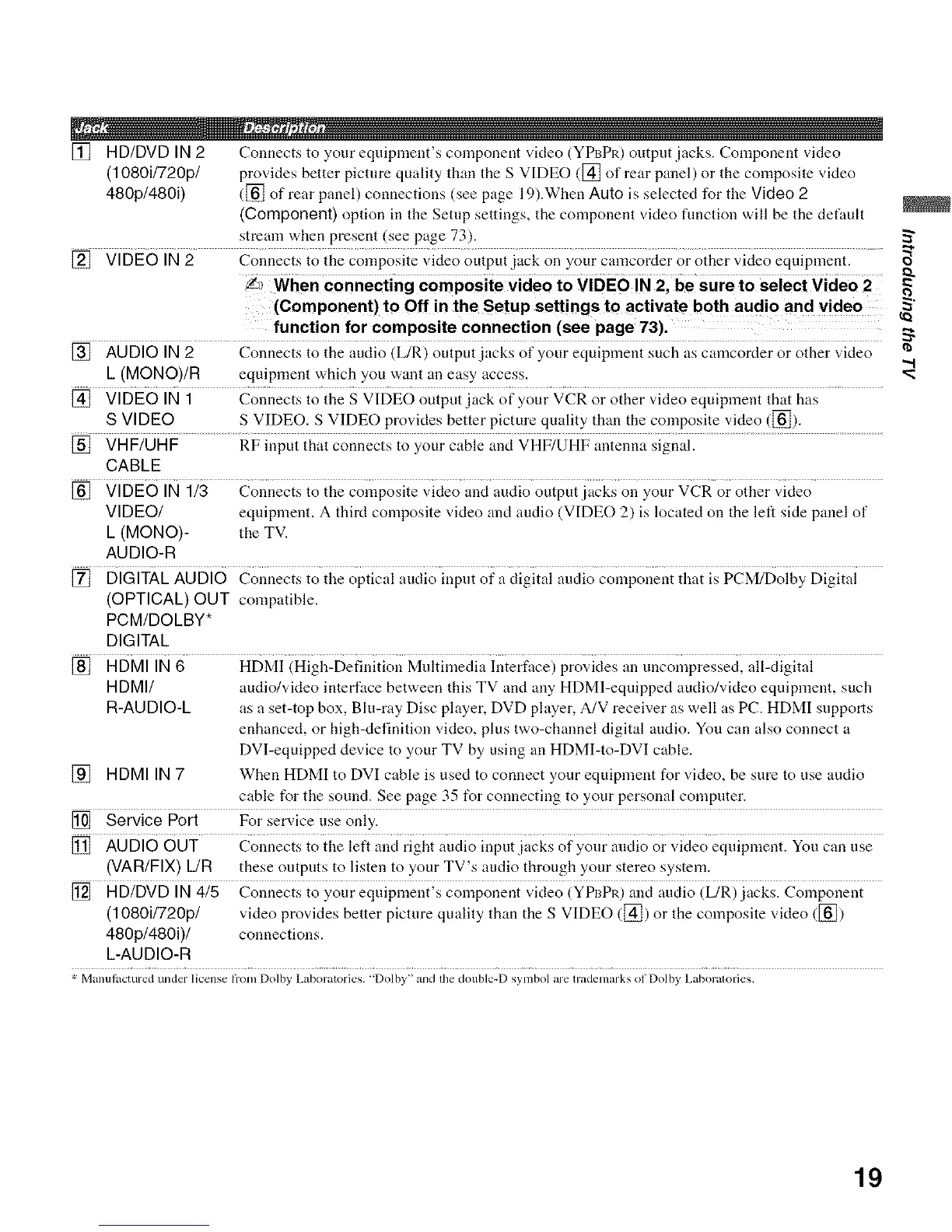[] HD/DVD IN 4/5 Connects to your equipment's component video (YPI3PIQ and audio (L/R)jacks. Component