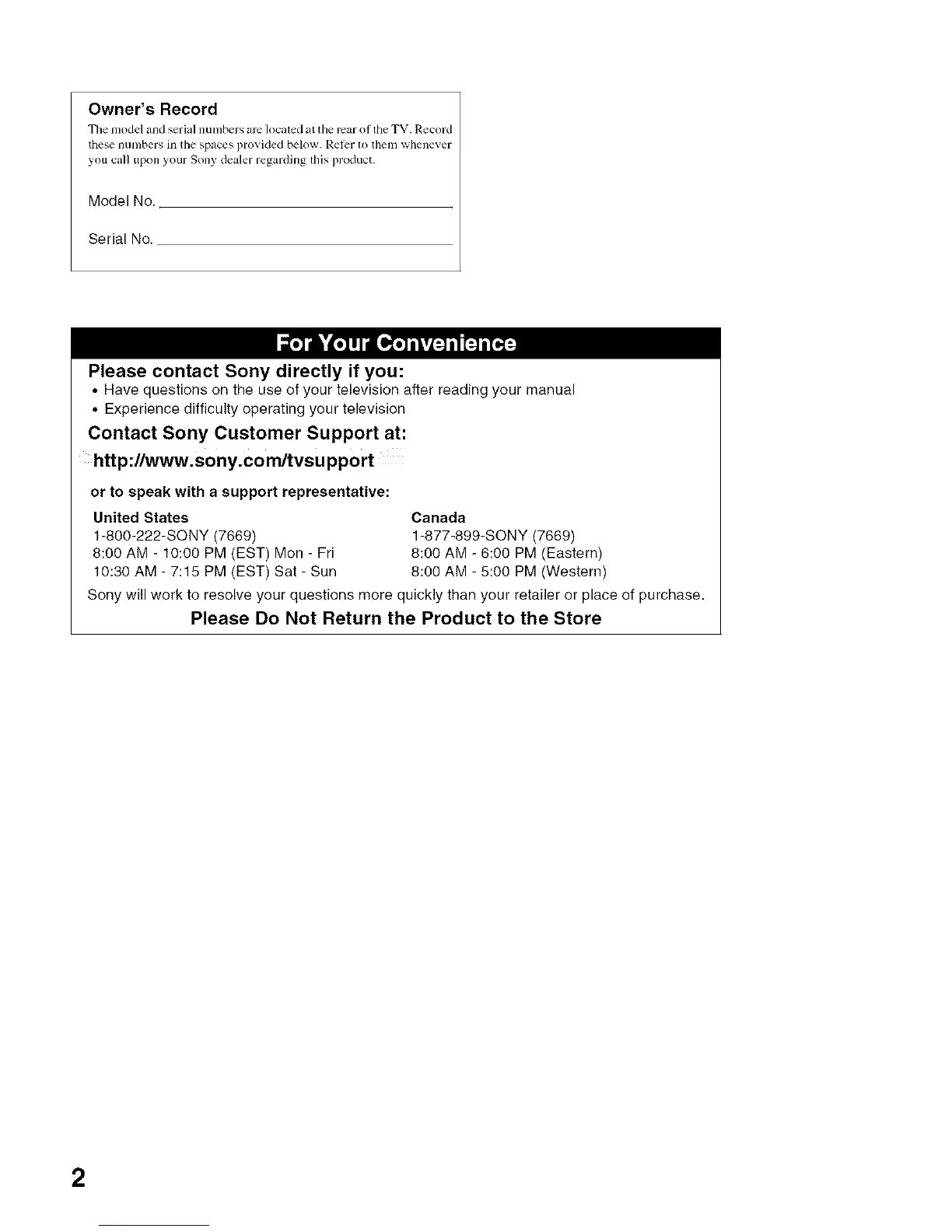 Sony will work to resolve your questions more quickly than your retailer or place of purchase.