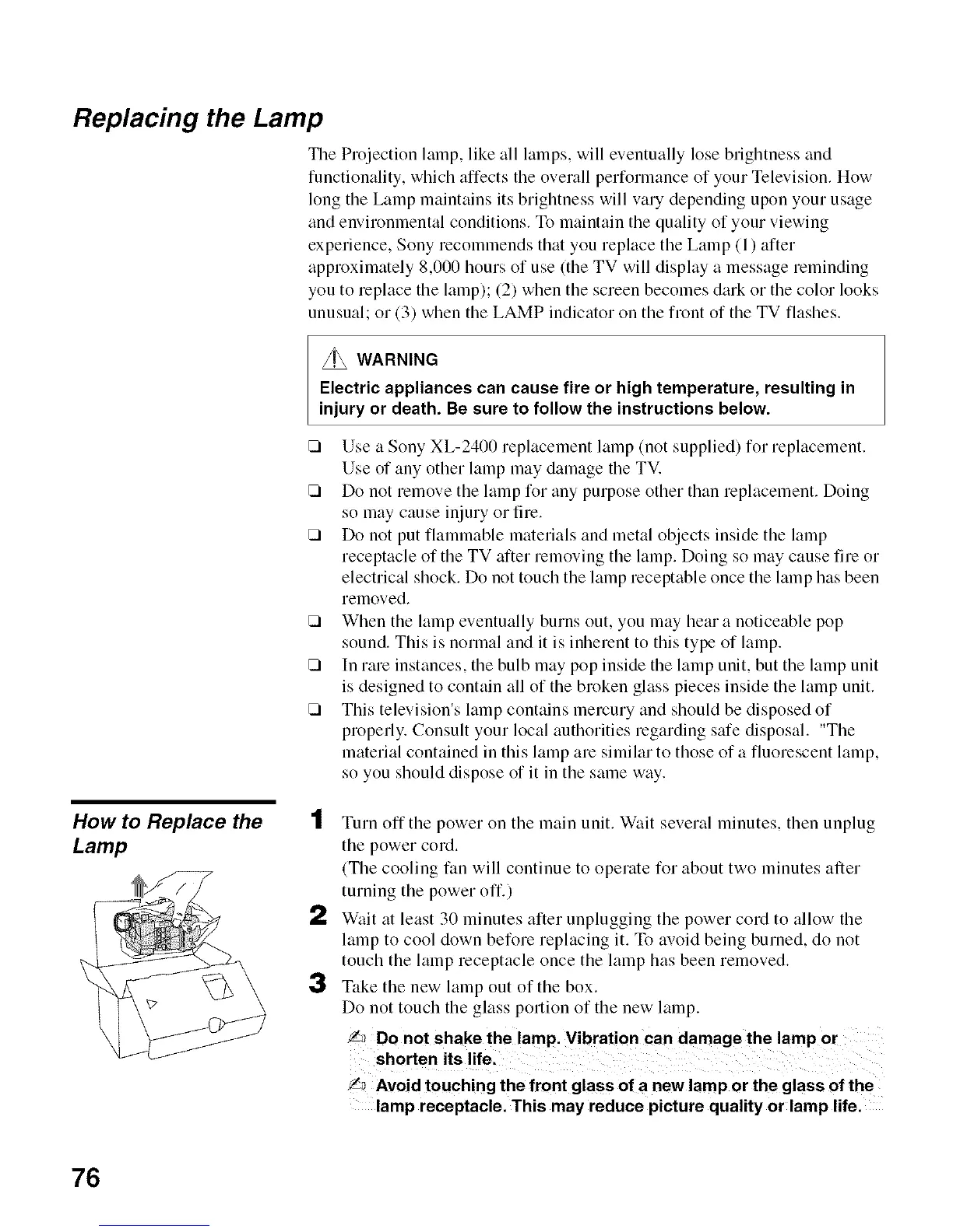 [] Use a Sony XL-2400 replacement lamp (not supplied) for replacement.