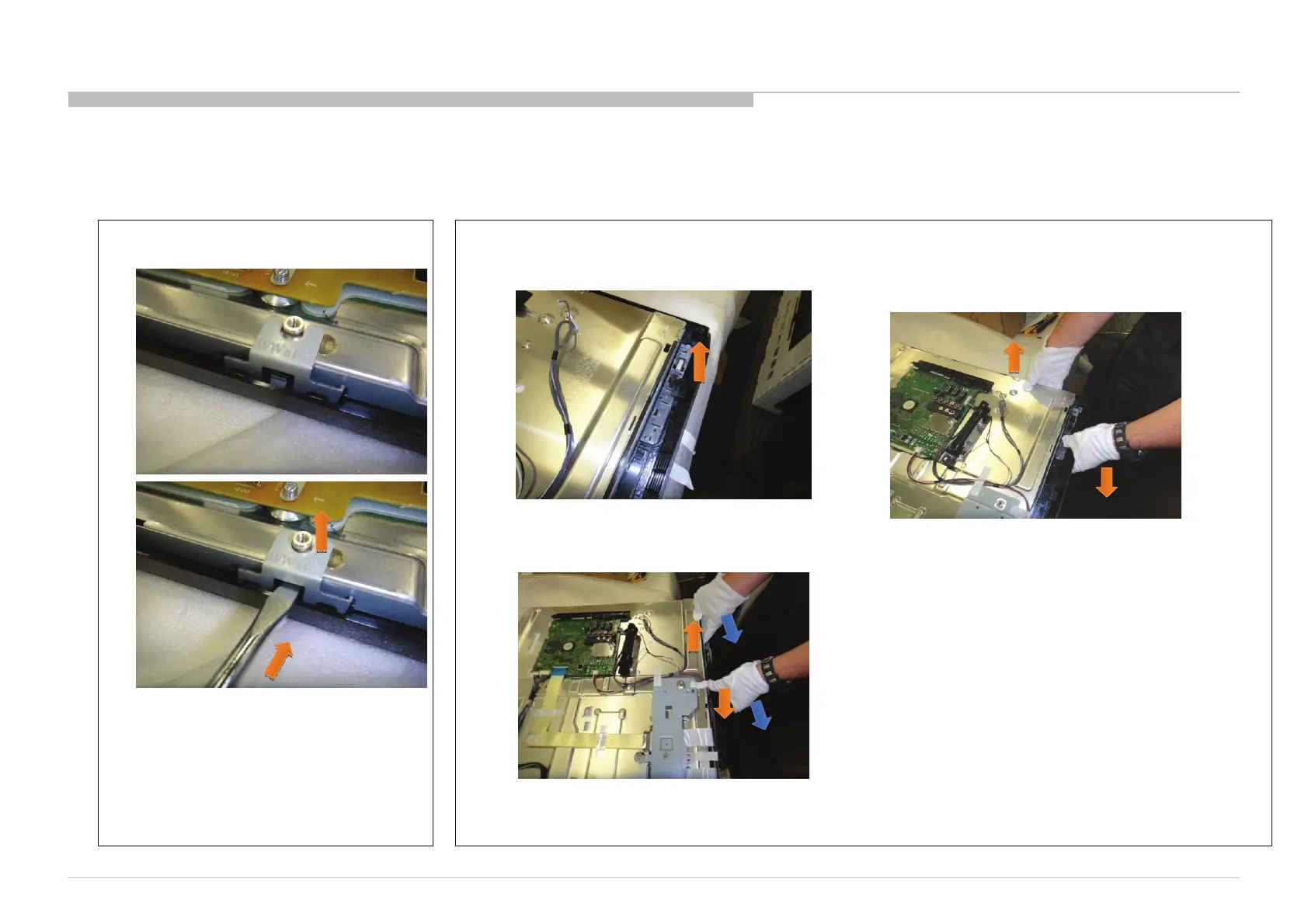 (1)Take off LED board to assist with tape peel off. (2)Put hand between bezel and panel, pull panel up and