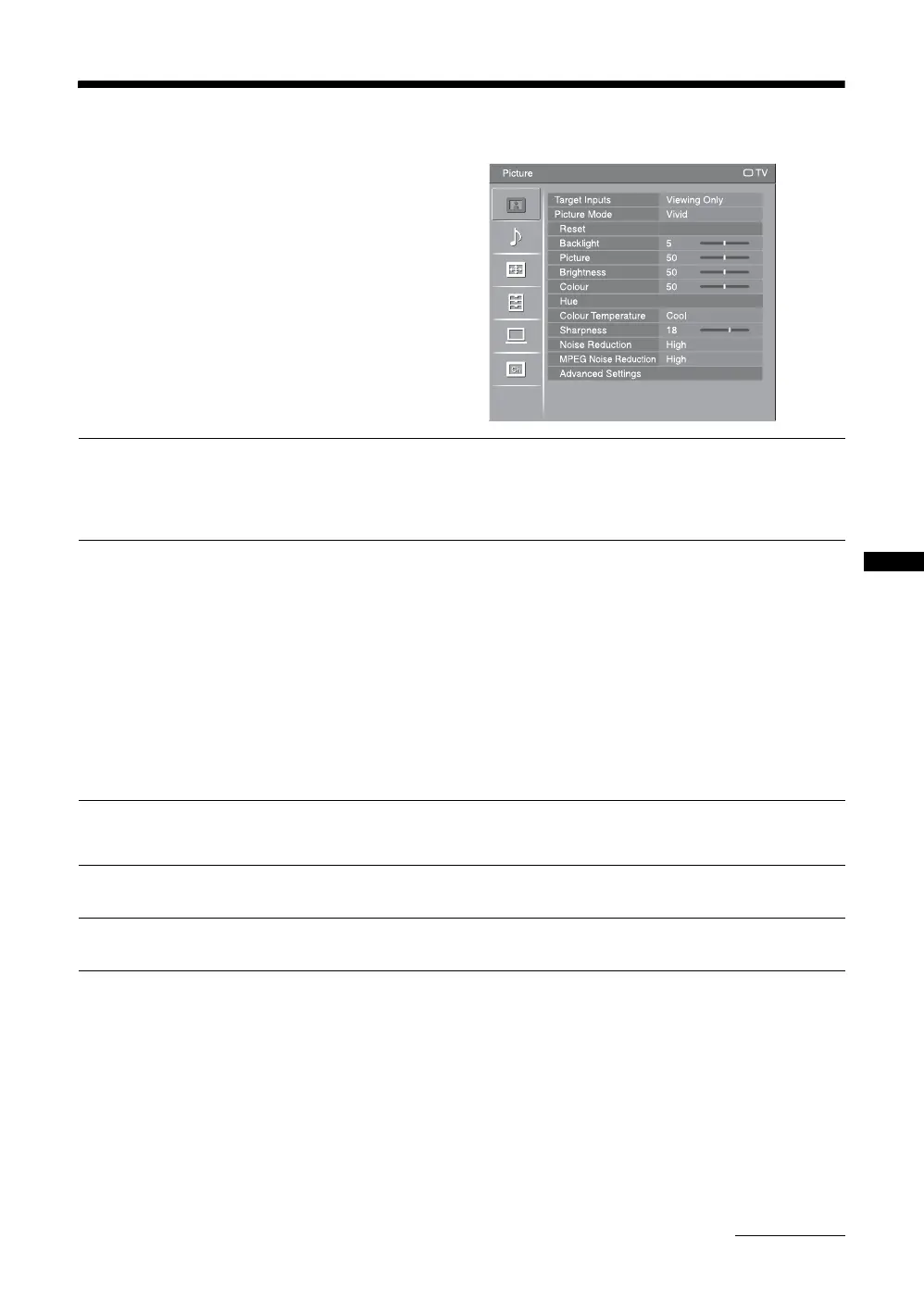 Resets all the “Picture” settings except “Target Inputs”, “Picture Mode” and