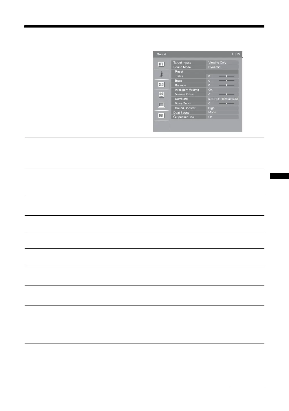 Resets all the “Sound” settings except “Target Inputs”, “Sound Mode”, “Dual