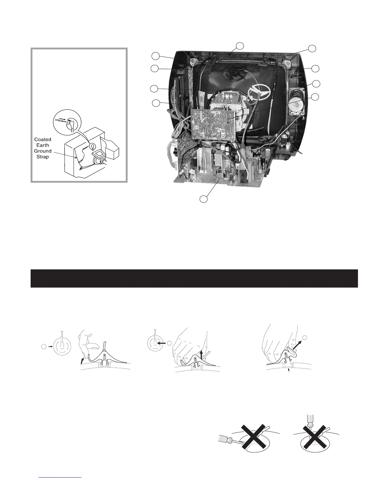 9. Remove the CRT grounding strap and spring tension devices.