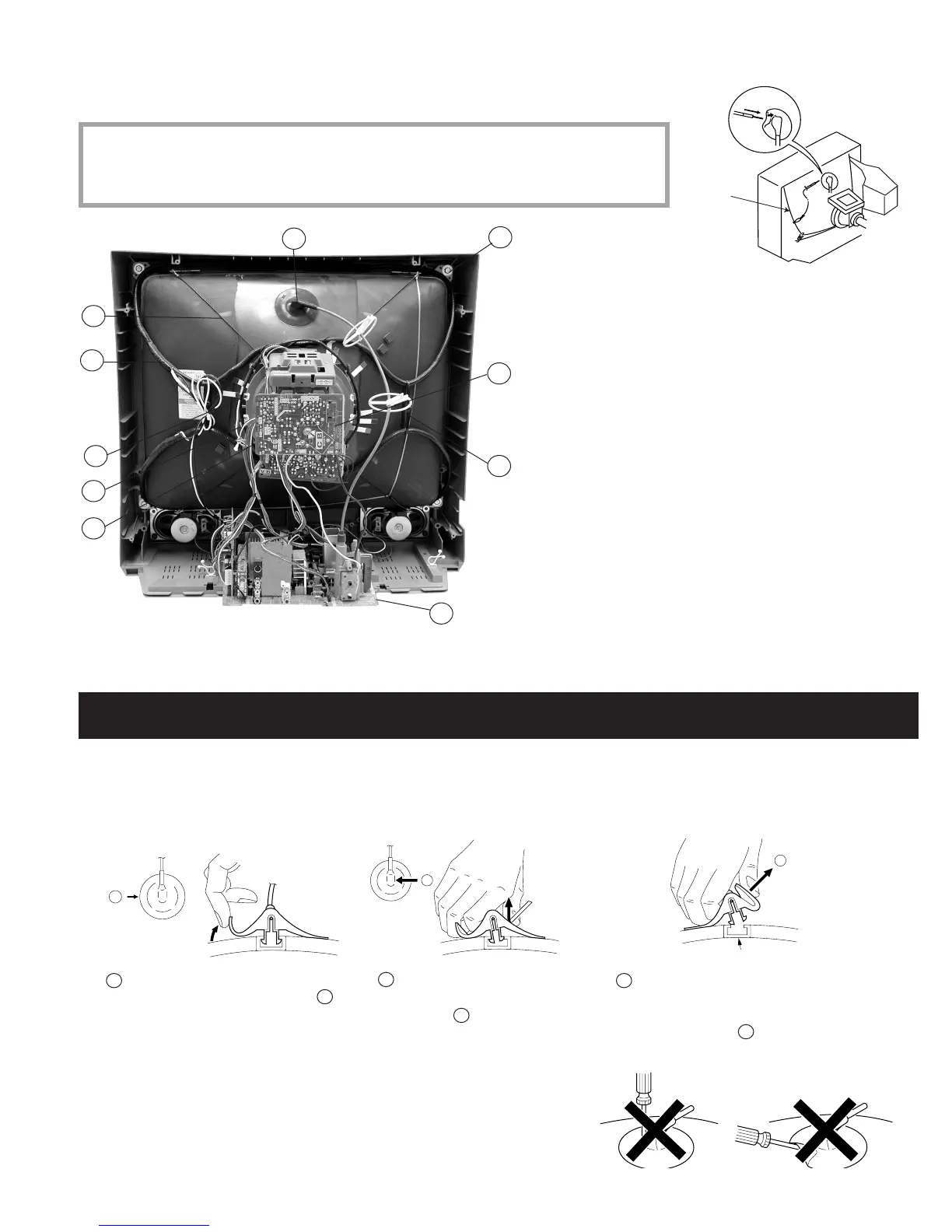 NOTE: After removing the anode cap, short circuit the anode of the picture tube and the anode cap to either the metal chassis, CRT shield, or