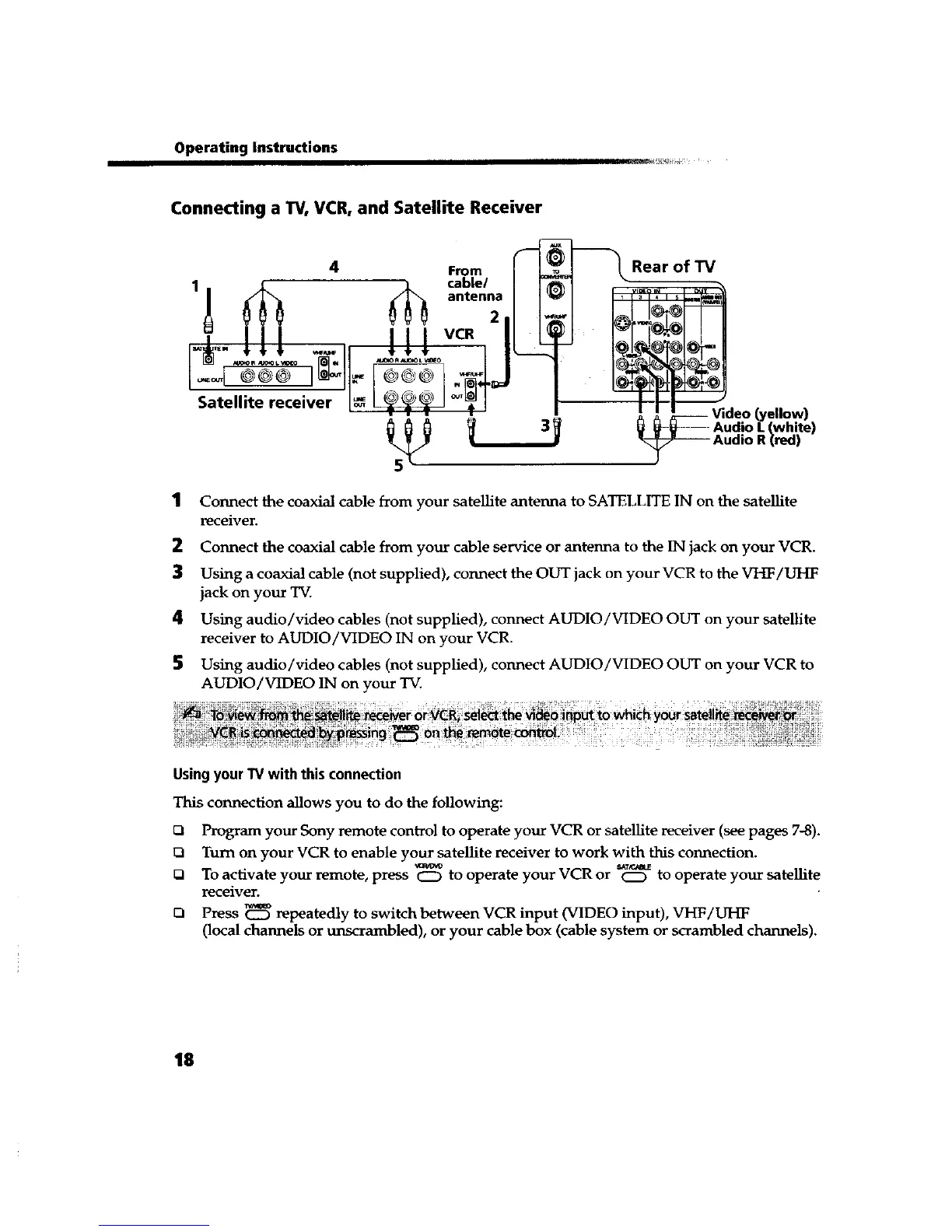 O Program your Sony remote control to operate your VCR or satellite receiver (see pages 7-8).