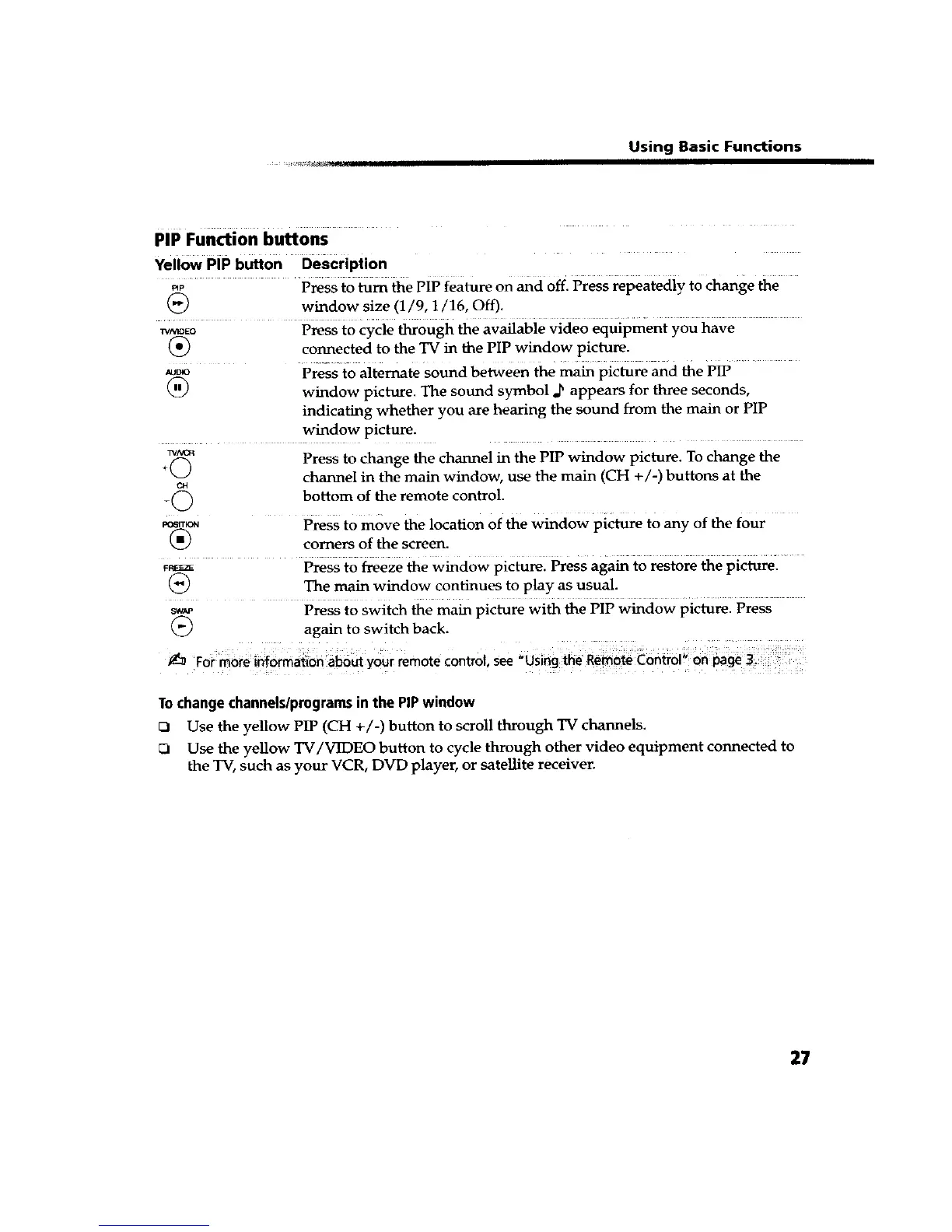UI Use the yellow PIP (CH +/-) button to scroll through TV channels.