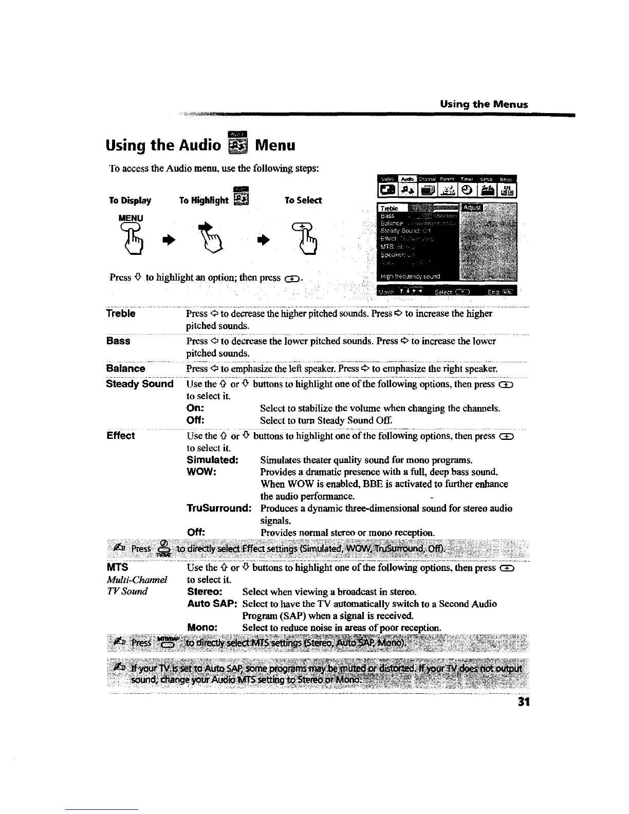 Treble Press <_to decrease the higher pitched sounds. Press €, to increase the higher