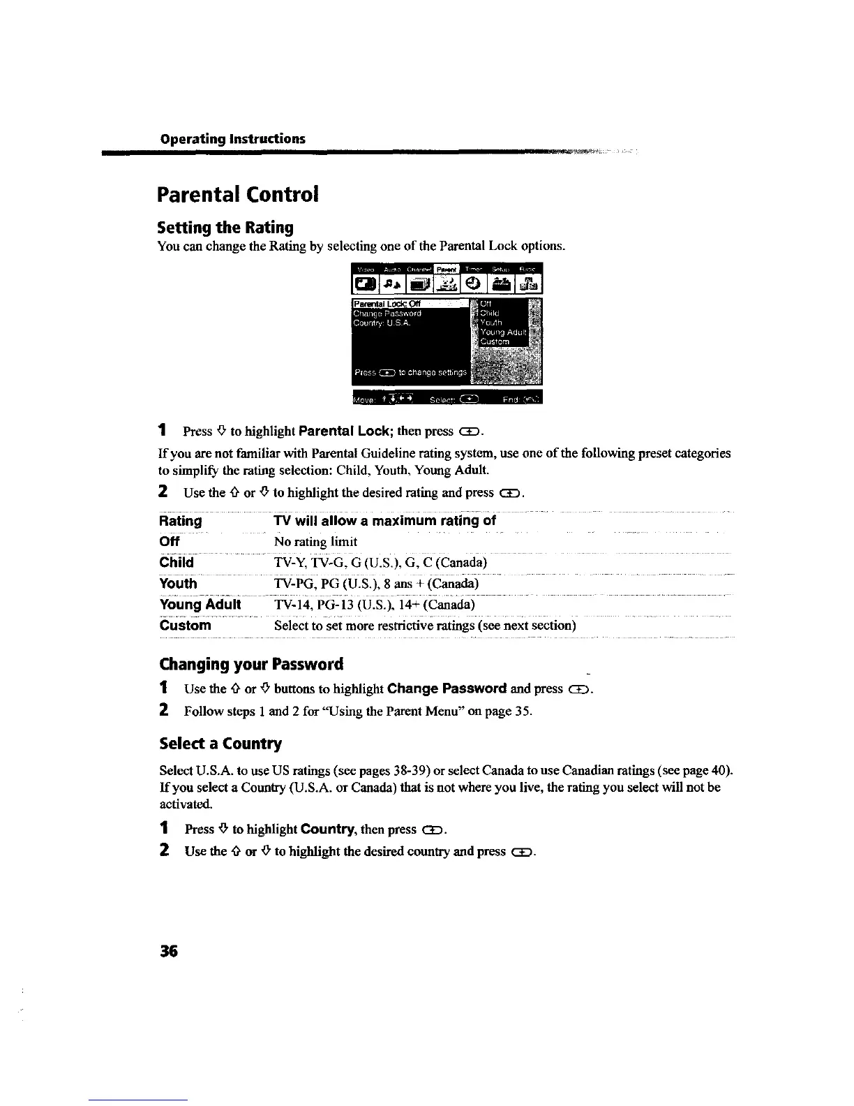 Select U.S.A. to use US ratings (see pages 38-39) or select Canada to use Canadian ratings (see page 40).
