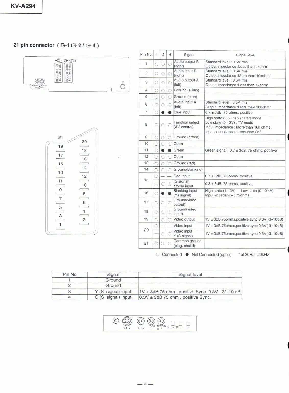 Sony KV-A2941A - 21-Pin Connector Details; Pin Signal Level Specifications
