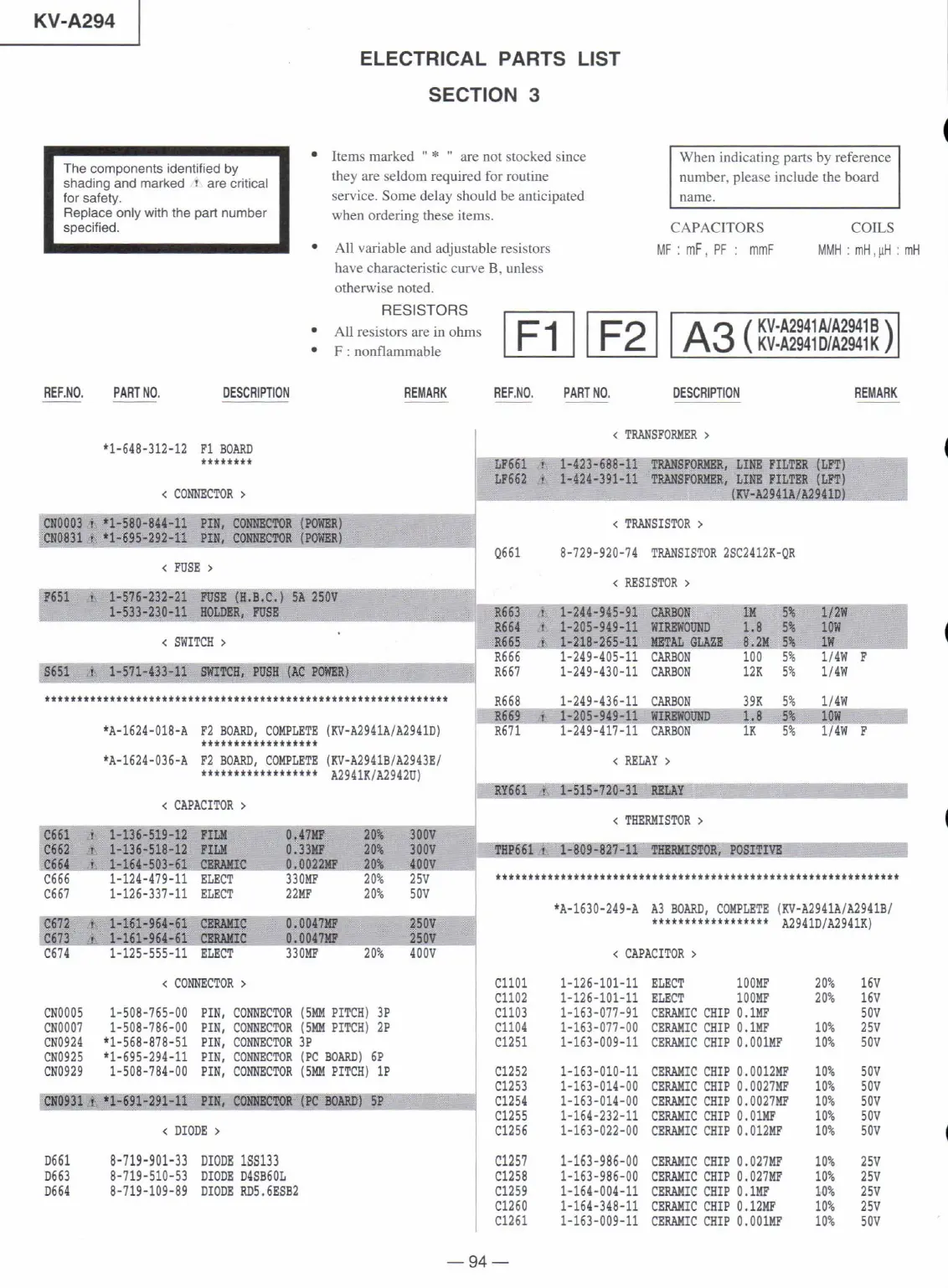 Sony KV-A2941A - Electrical Parts List; Resistors, Capacitors, and Coils; Connectors, Diodes, and Other Components