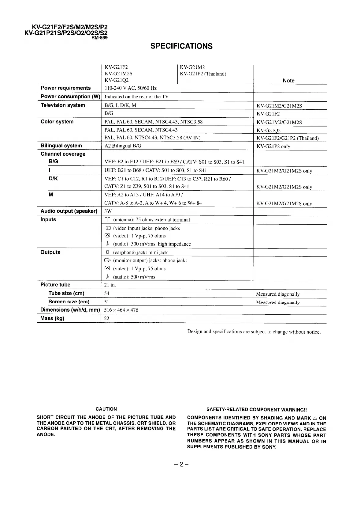 Sony KV-G21F2 - SPECIFICATIONS; Power Requirements; Television and Color Systems; Channel Coverage