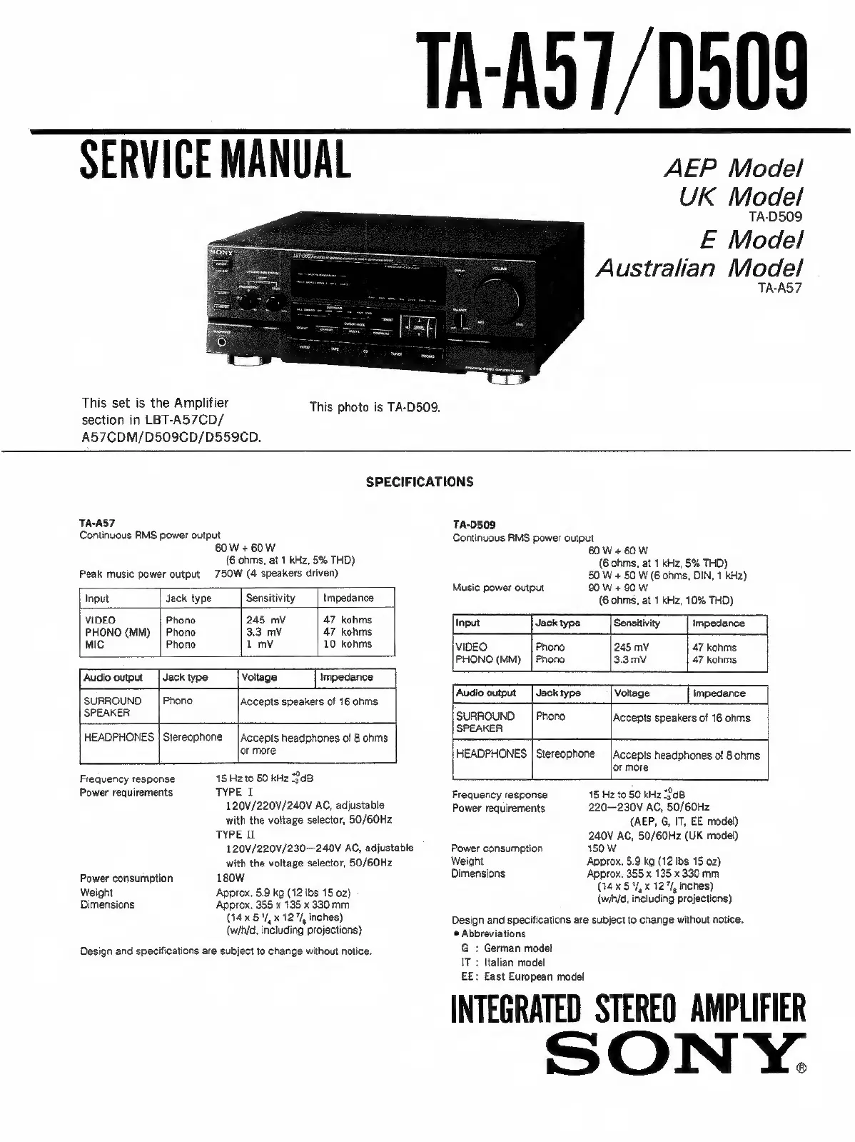 Sony LBT-A57CD - Specifications; TA-A57 Specifications; TA-D509 Specifications