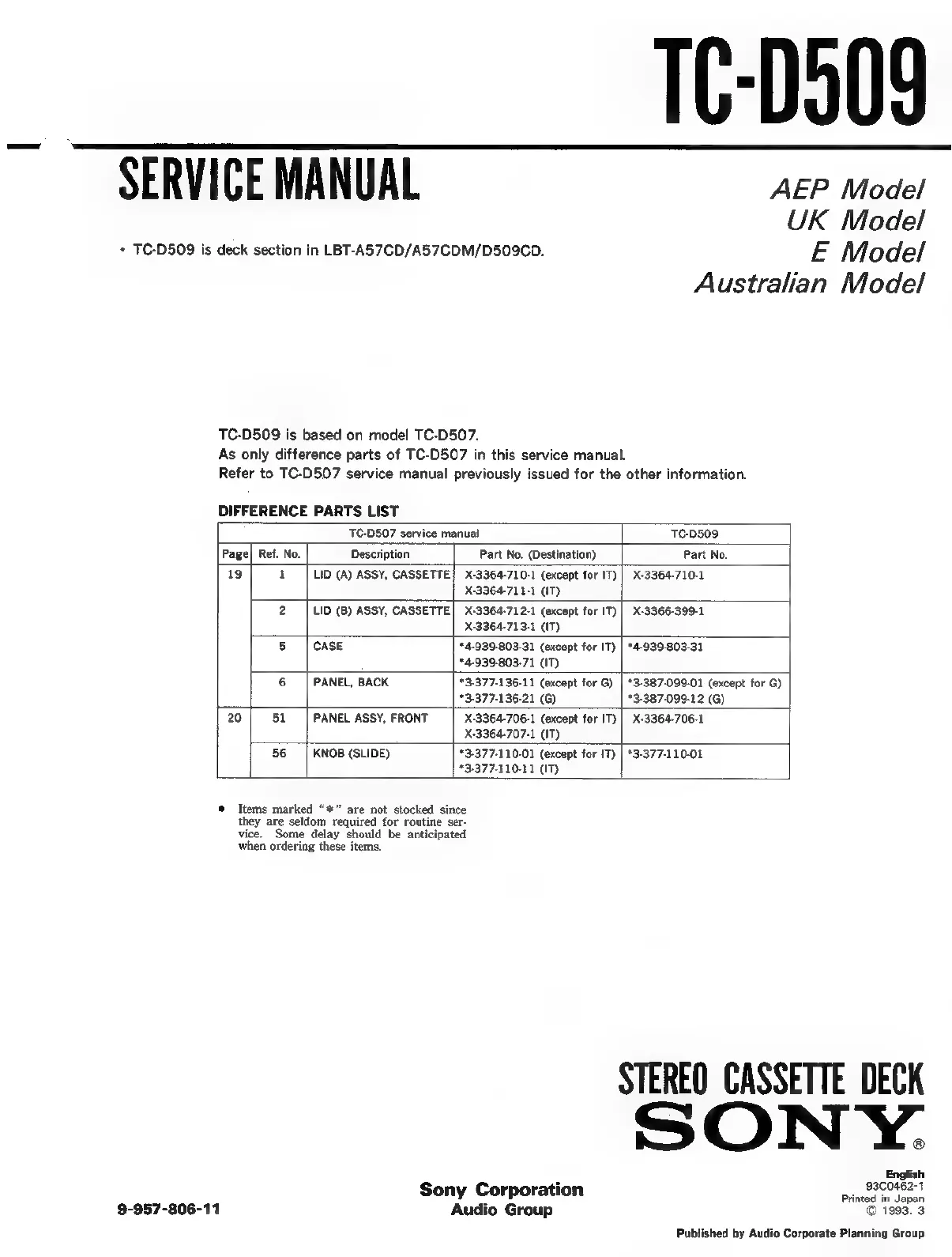 Sony LBT-A57CD - Difference Parts List (TC-D507)