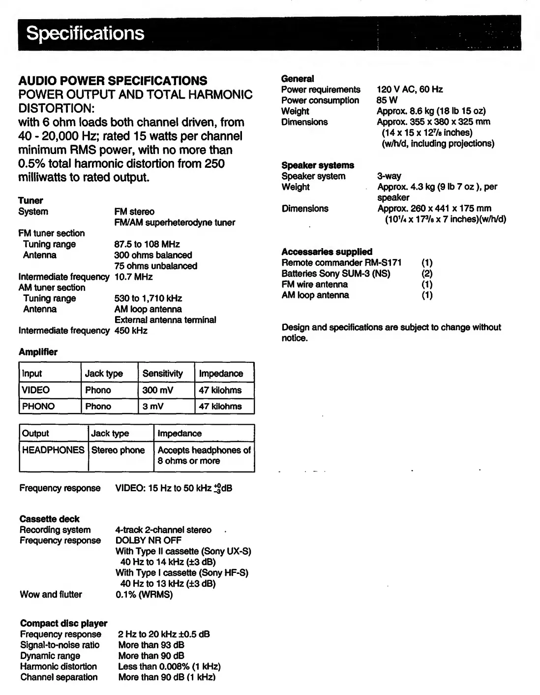 Sony LBT-D117CD - Technical Specifications; Power and Tuner Specs; Amplifier, Cassette, and CD Specs