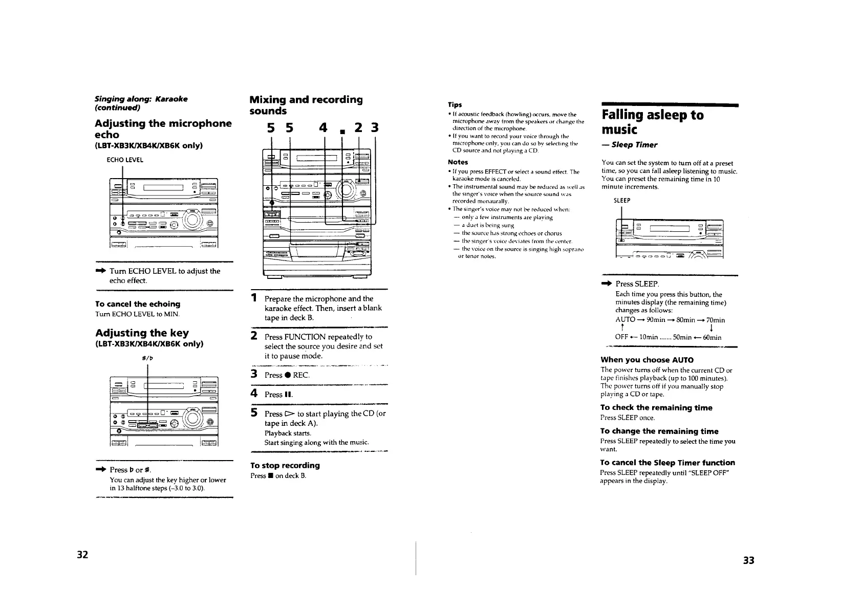 Sony LBT-D290 - Karaoke, Sound Mixing, and Sleep Timer; Karaoke Adjustments; Sound Mixing and Recording; Sleep Timer Function