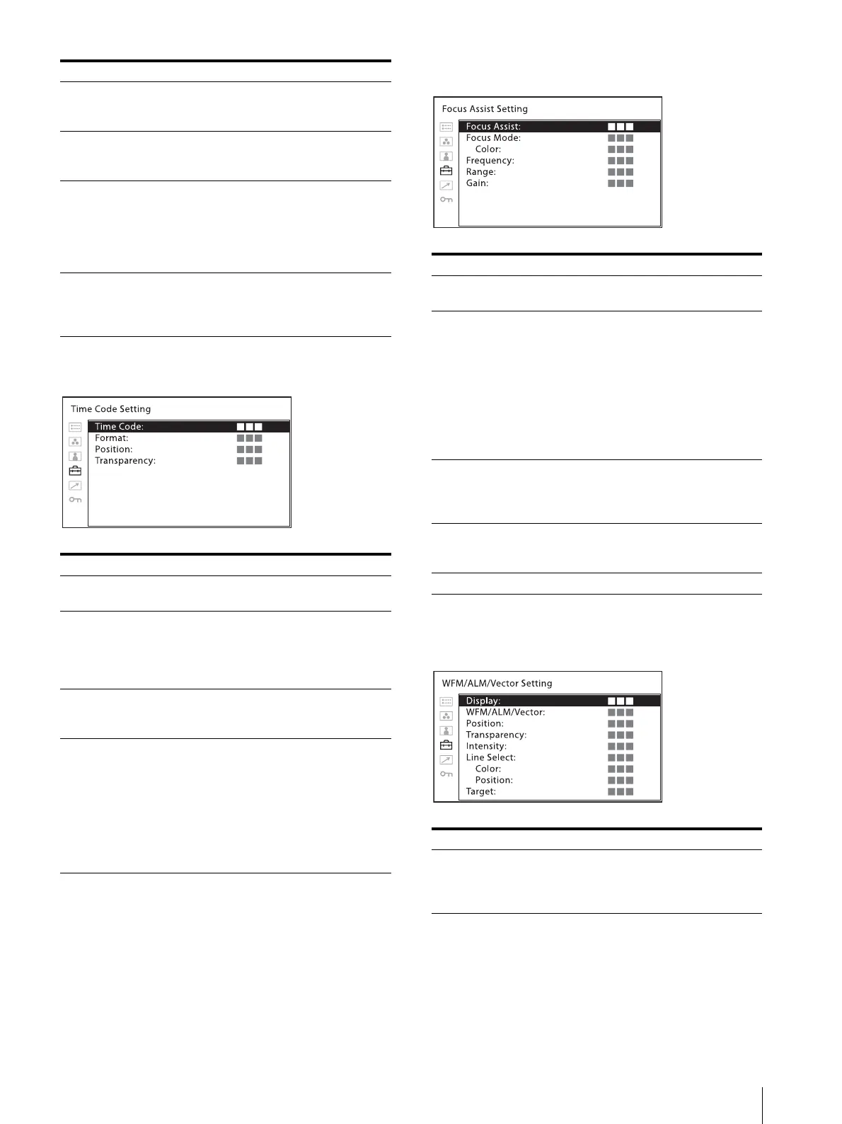 audio level meter, and vectorscope) Setting]