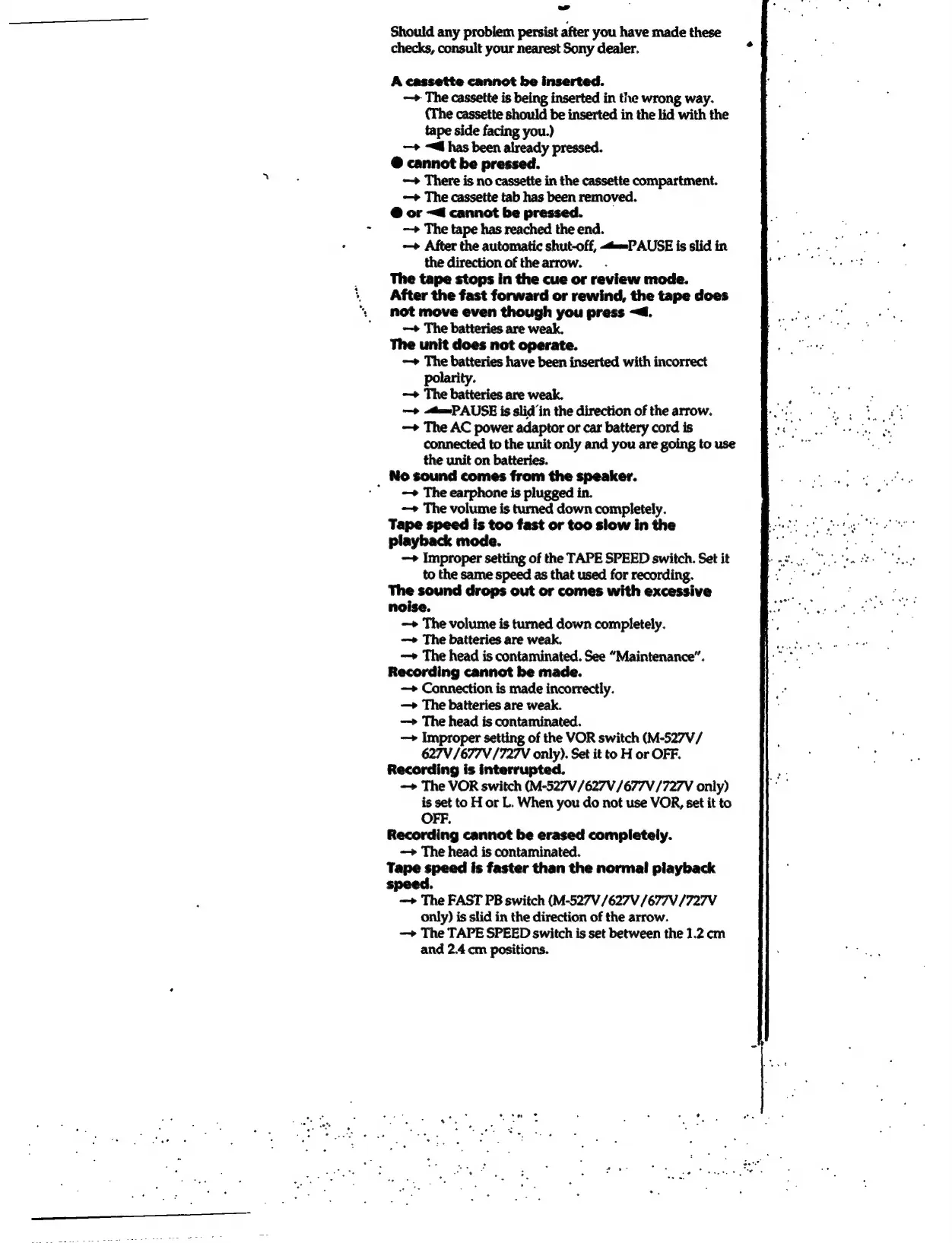 Sony M-425 - Troubleshooting; Cassette Insertion Issues; Playback and Sound Problems; Recording Problems