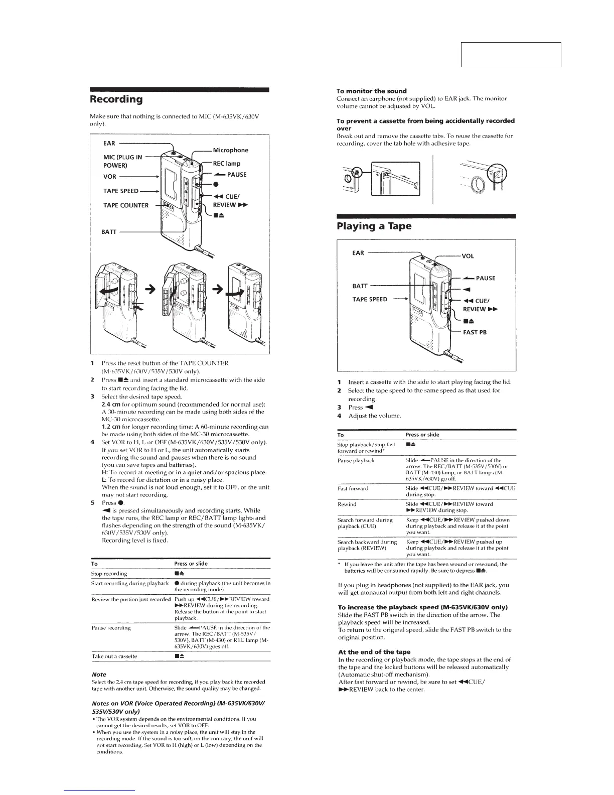 Sony m-430 - GENERAL; Recording; Playing a Tape