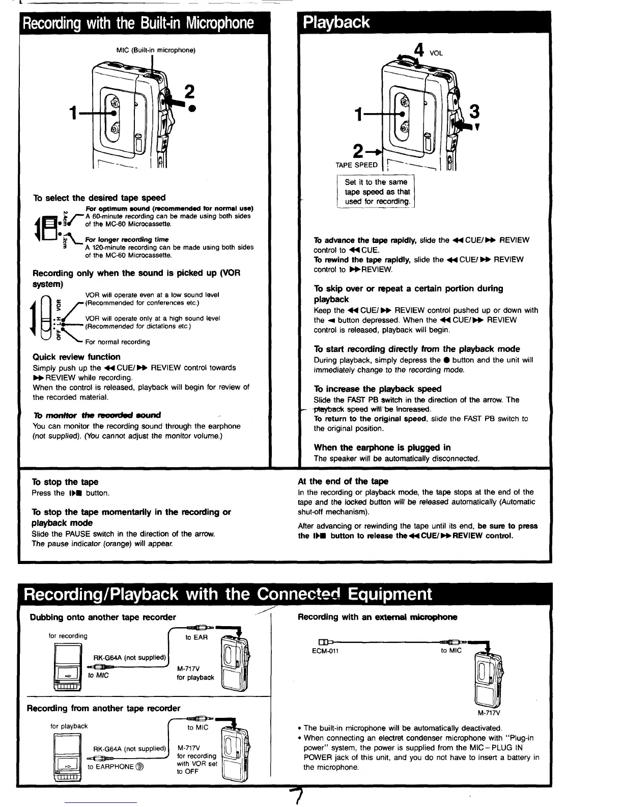 Sony M-717V Primary - Recording with the Built-In Microphone; Playback; Recording;Playback with the Connected Equipment; To Select the Desired Tape Speed