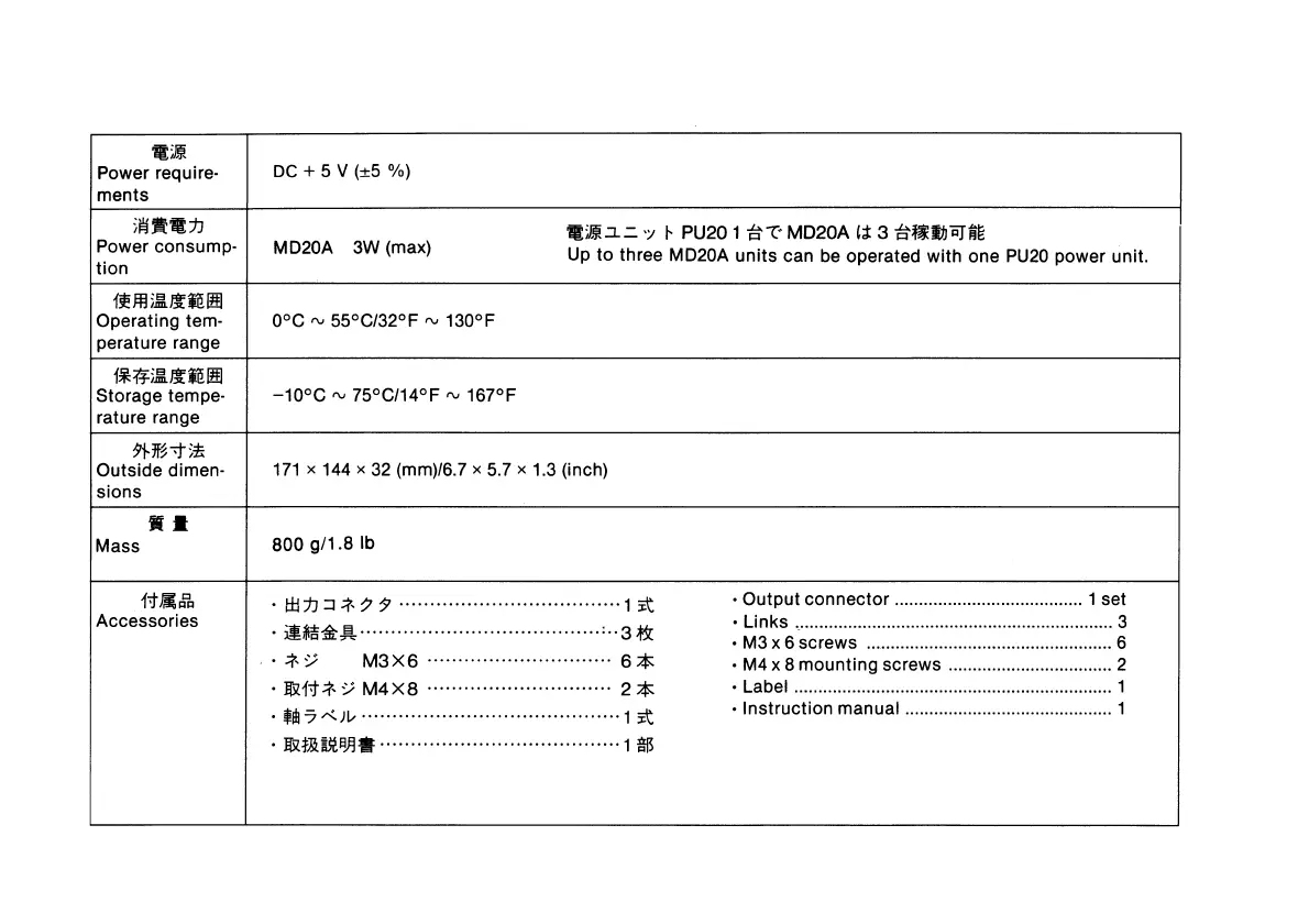 Sony Magnescale MD20A - Power Requirements; Power Consumption; Operating Temperature Range; Storage Temperature Range