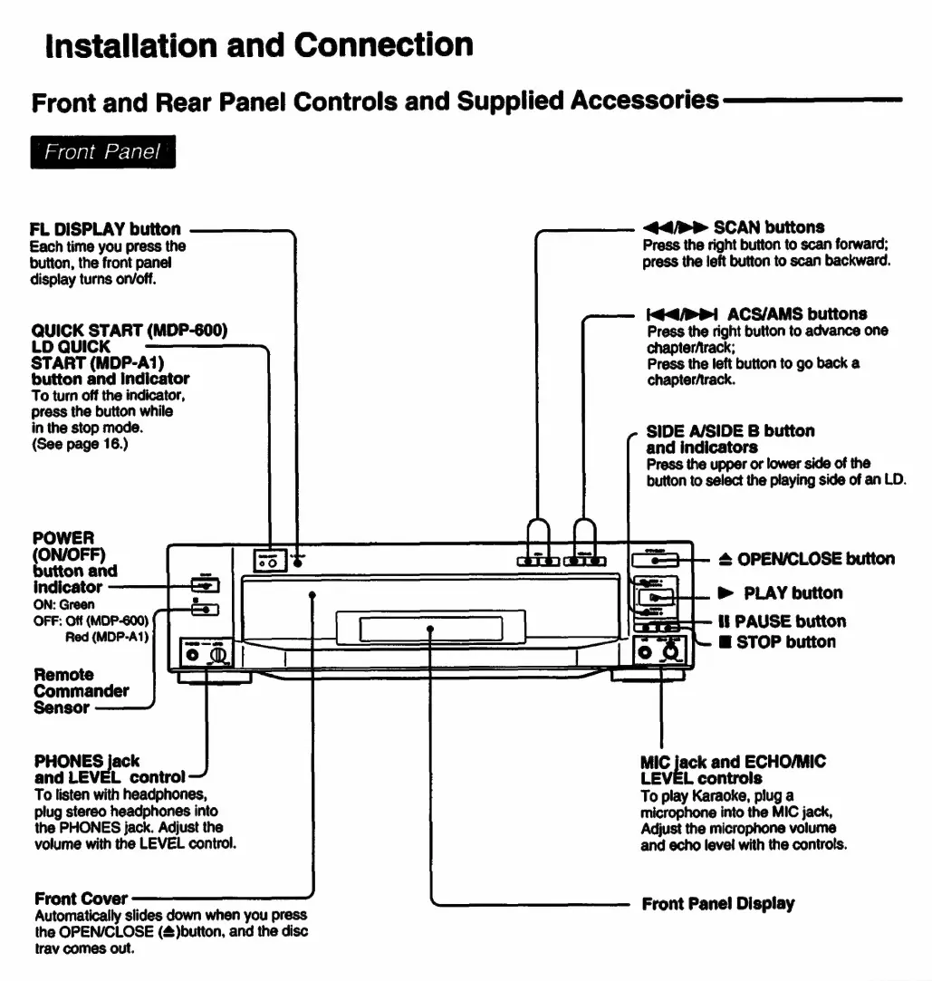 Sony MDP-600 - Installation and Connection - Front Panel; Front Panel Controls