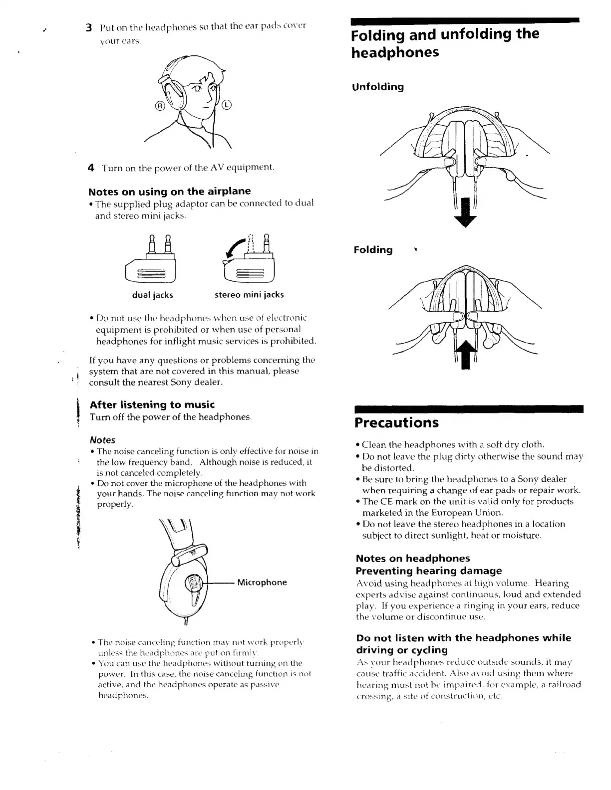 Sony MDR NC20 - Folding and unfolding headphones; Precautions; Cleaning and Maintenance; Servicing and Repair