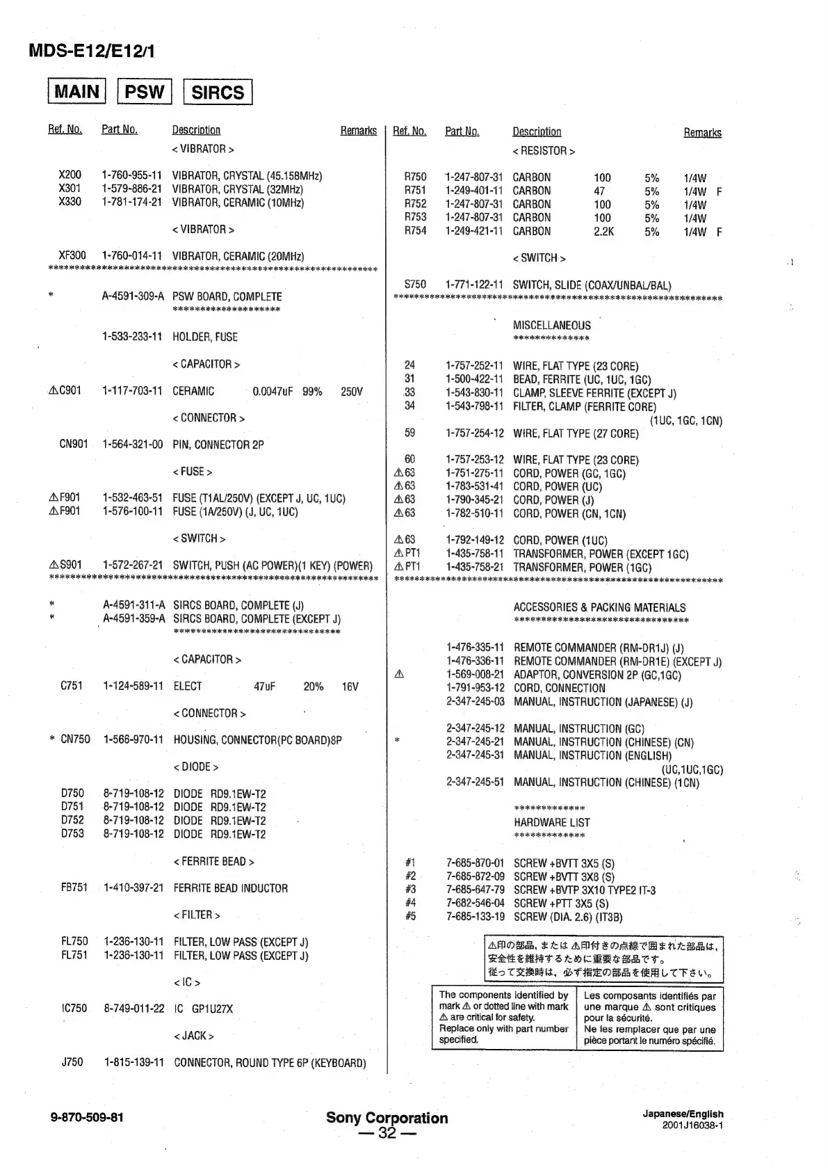 Sony MDS-E12 - SECTION 7 ELECTRICAL PARTS LIST; < VIBRATOR >; < FERRITE BEAD >; < FILTER >