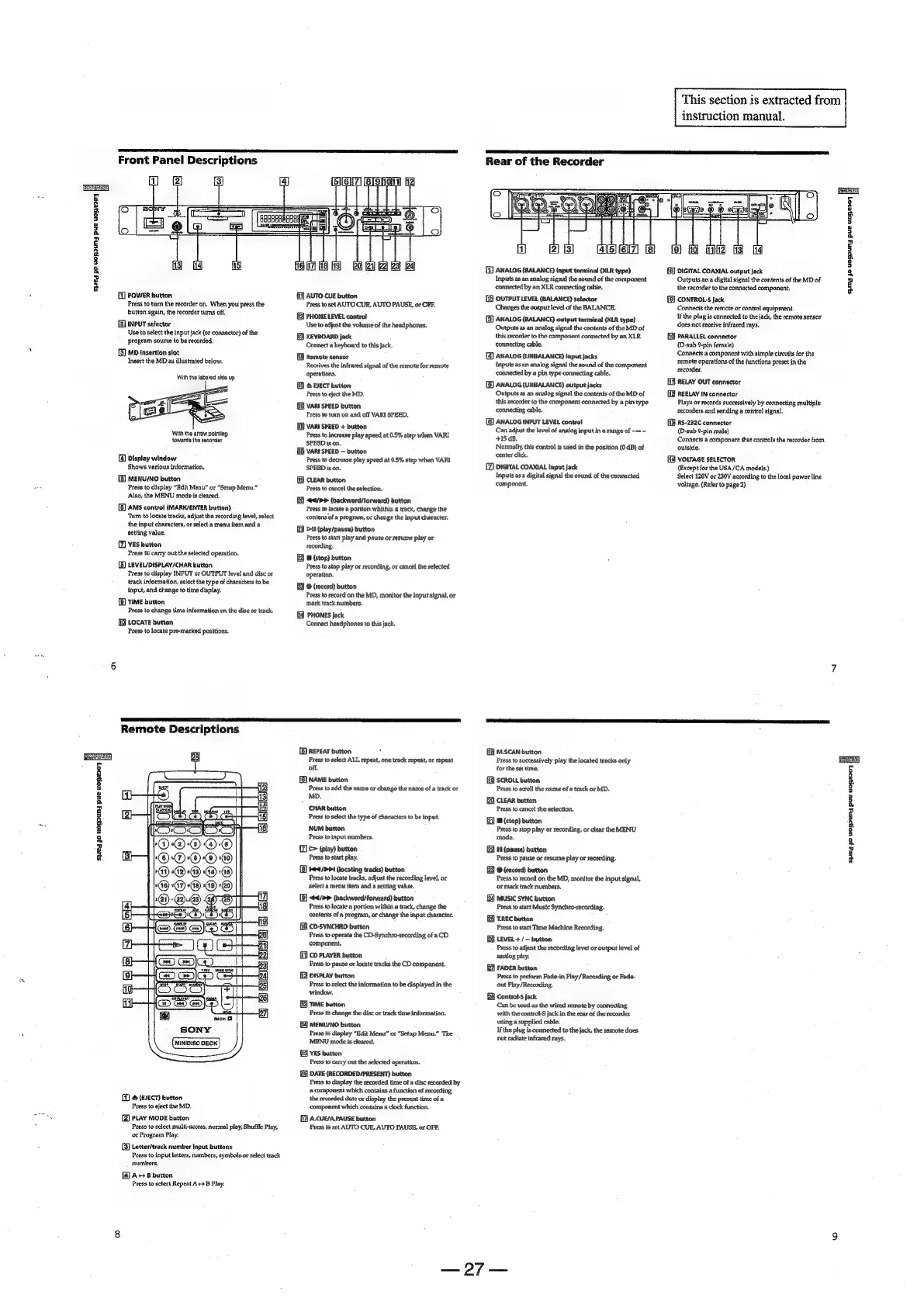 Sony MDS-E12 - Front Panel Descriptions; Remote Descriptions