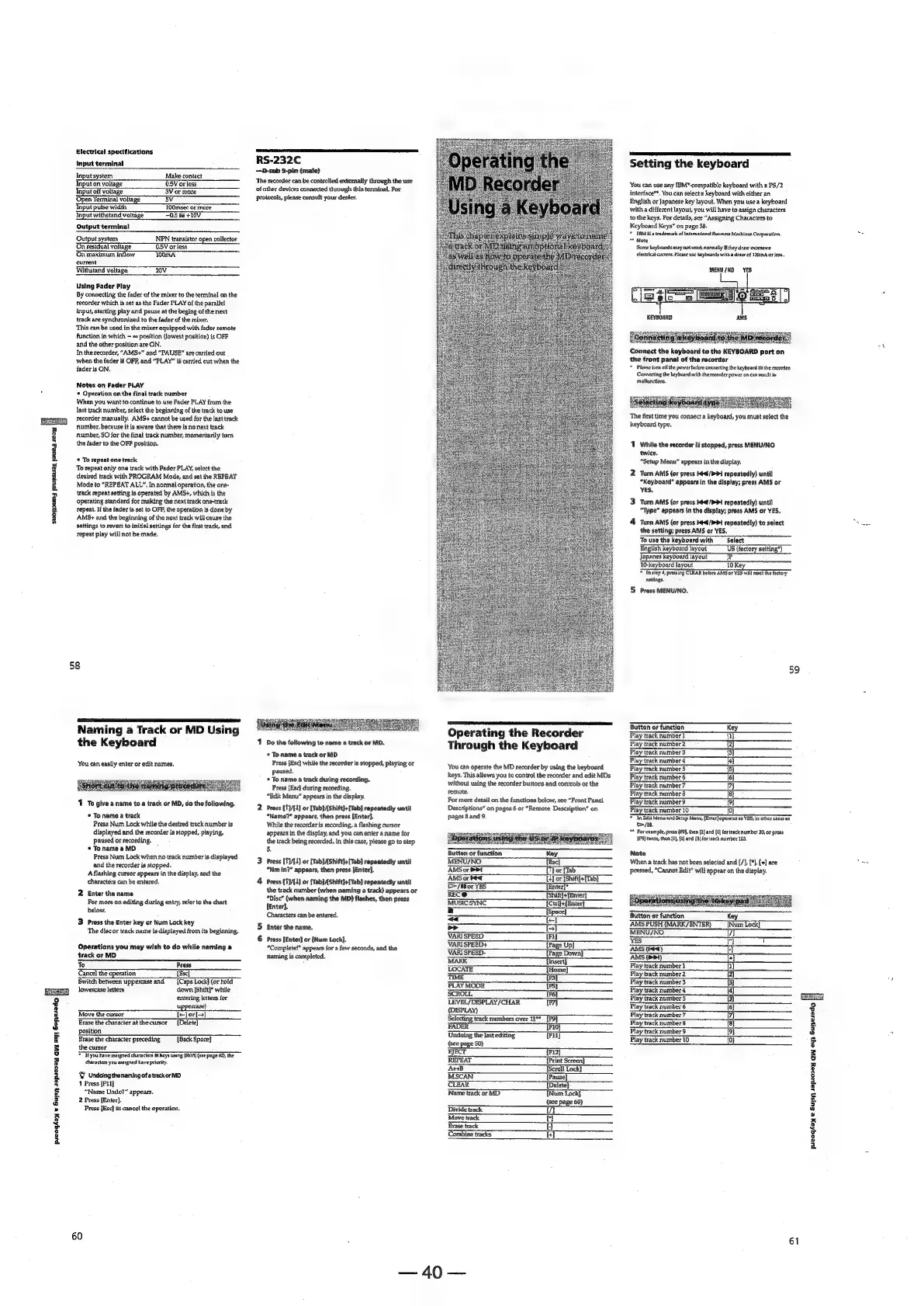 Sony MDS-E12 - Operating the Recorder Through the Keyboard; Connecting a Keyboard; Setting the Keyboard; Assigning Characters to Keyboard Keys